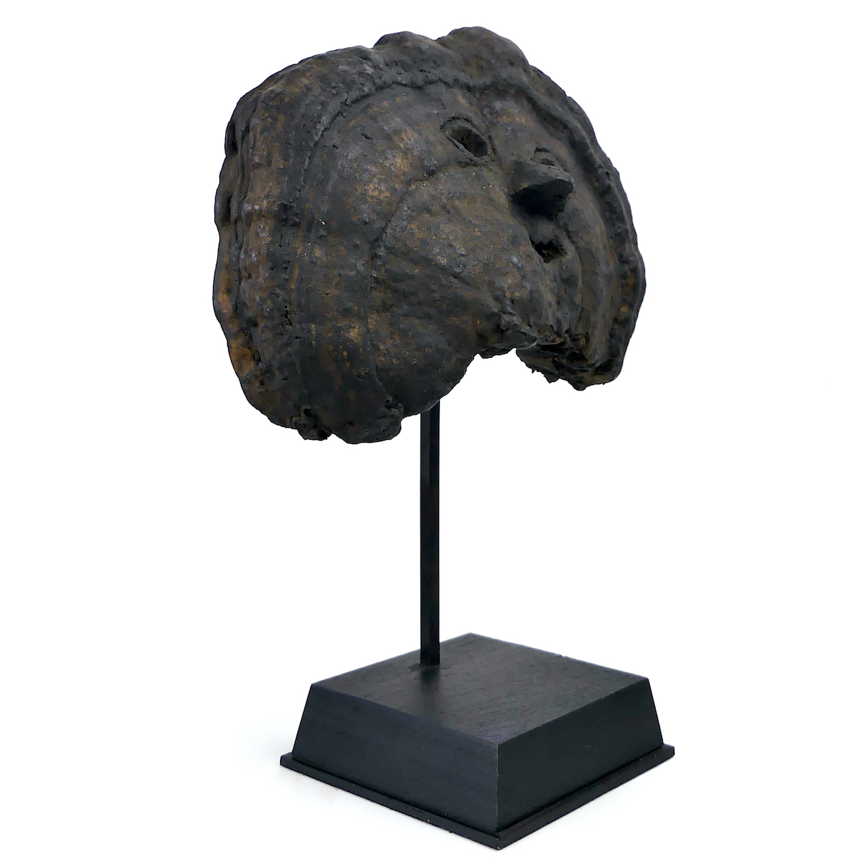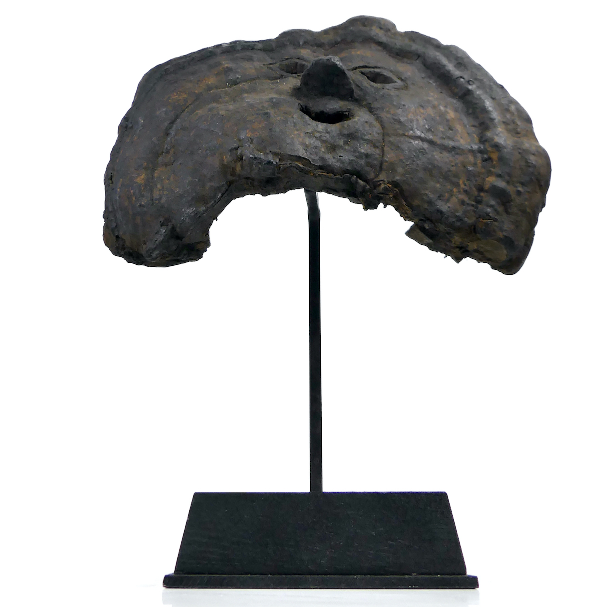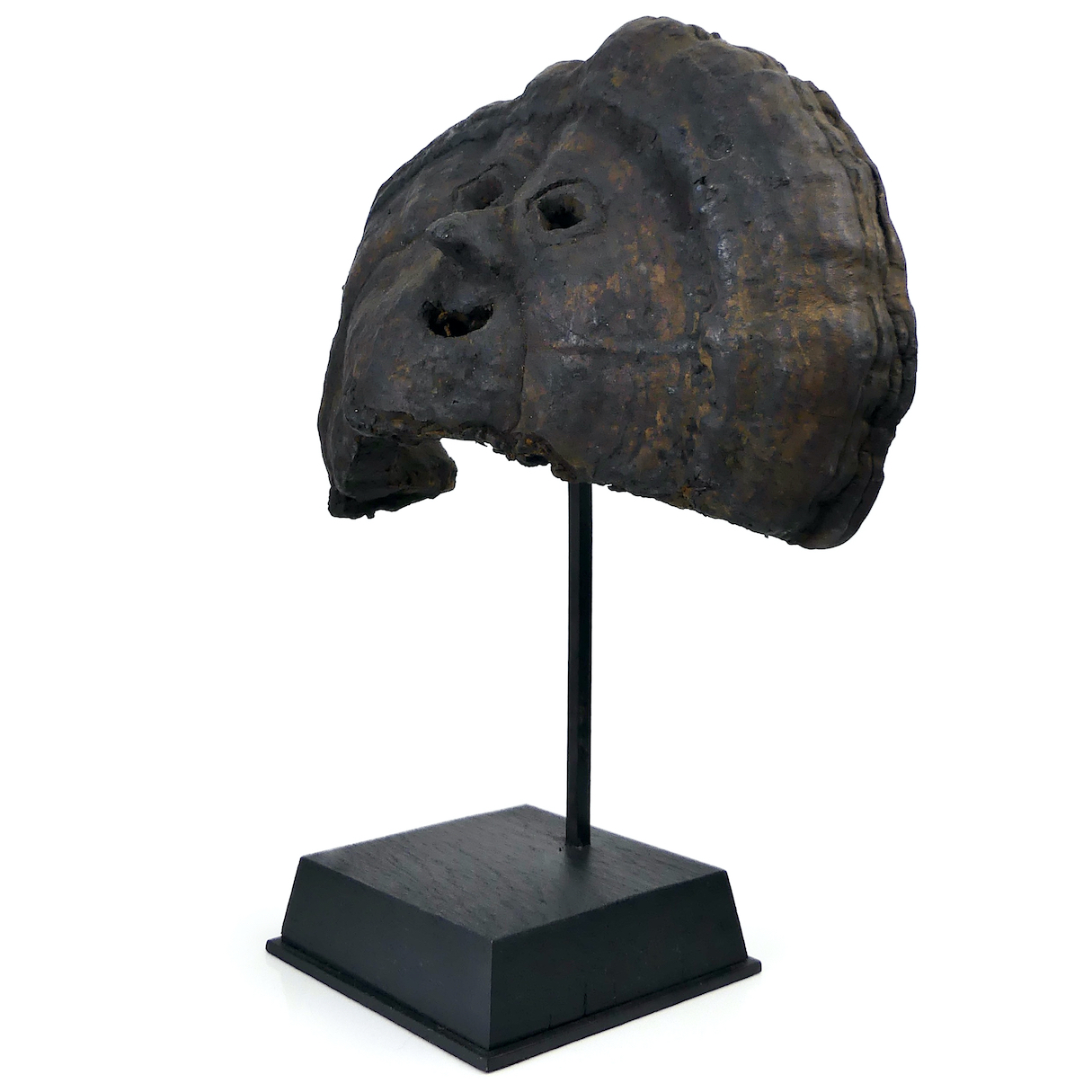 Masque de chaman népalais rare et ancien creusé dans un champignon Lingzhi sur socle en bois et acier noir – Himalaya – Masque de collection
