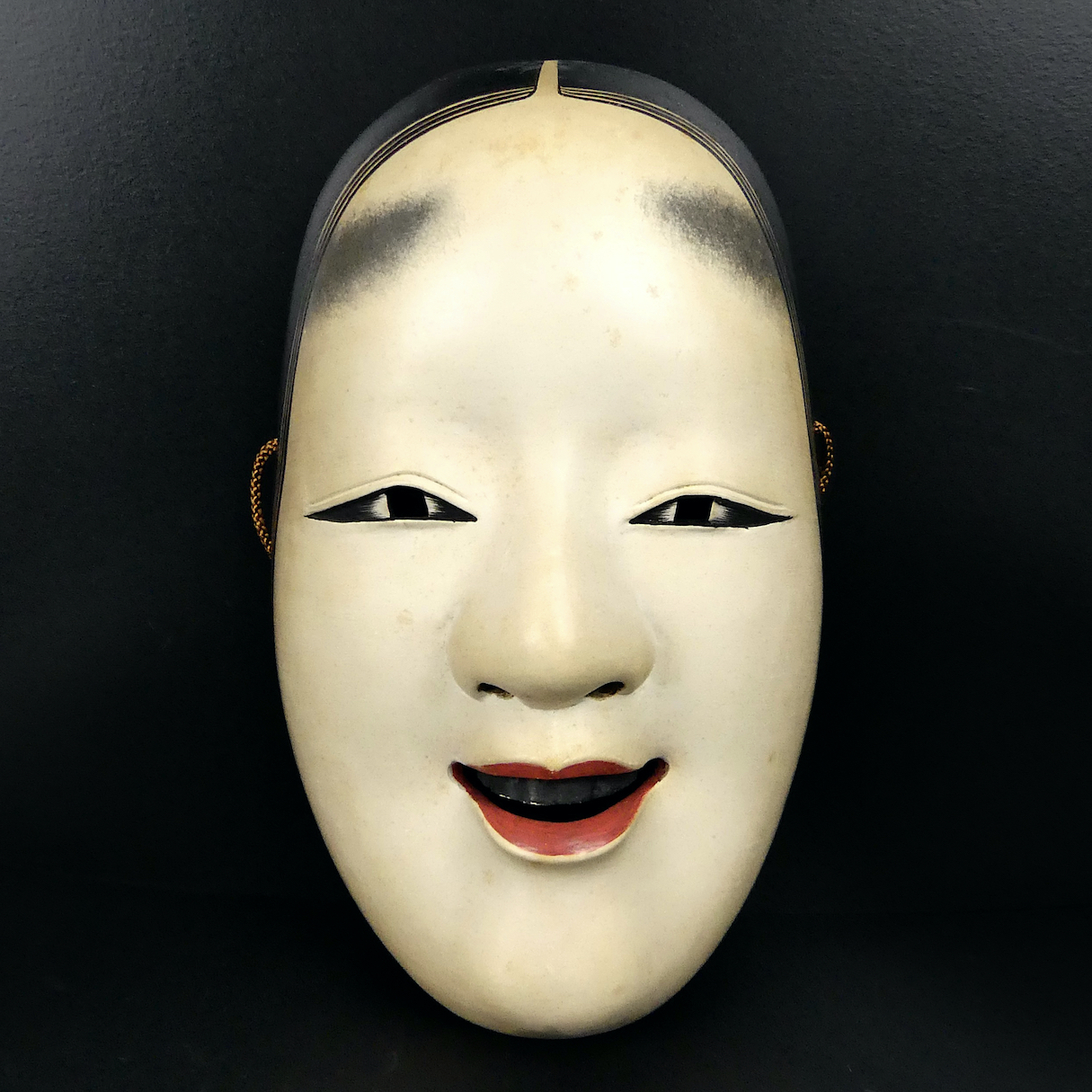 Masque Onnamen ancien signé masque de femme en bois de cyprès et laque sèche – Théâtre nô – Japon – Période Shōwa