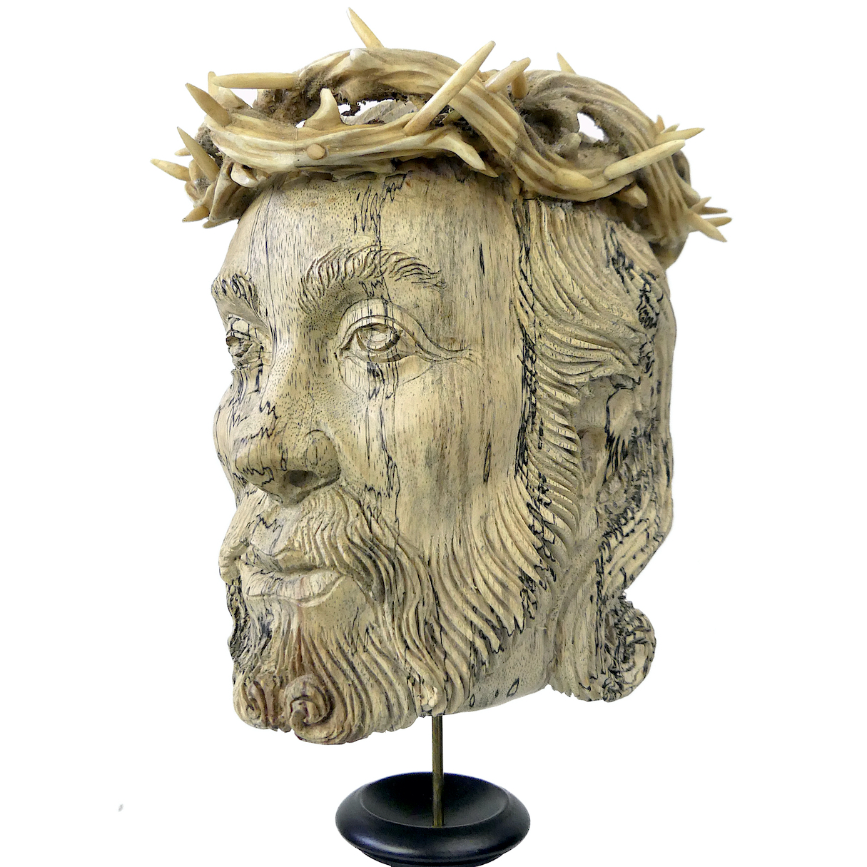 Memento Mori bicéphale représentant de tête du Christ, couronné d’épine en bois de cerf, à la chevelure et barbe abondante, et de l’autre coté un crâne, finement ciselé, avec précision, sur socle en bois tourné noir.