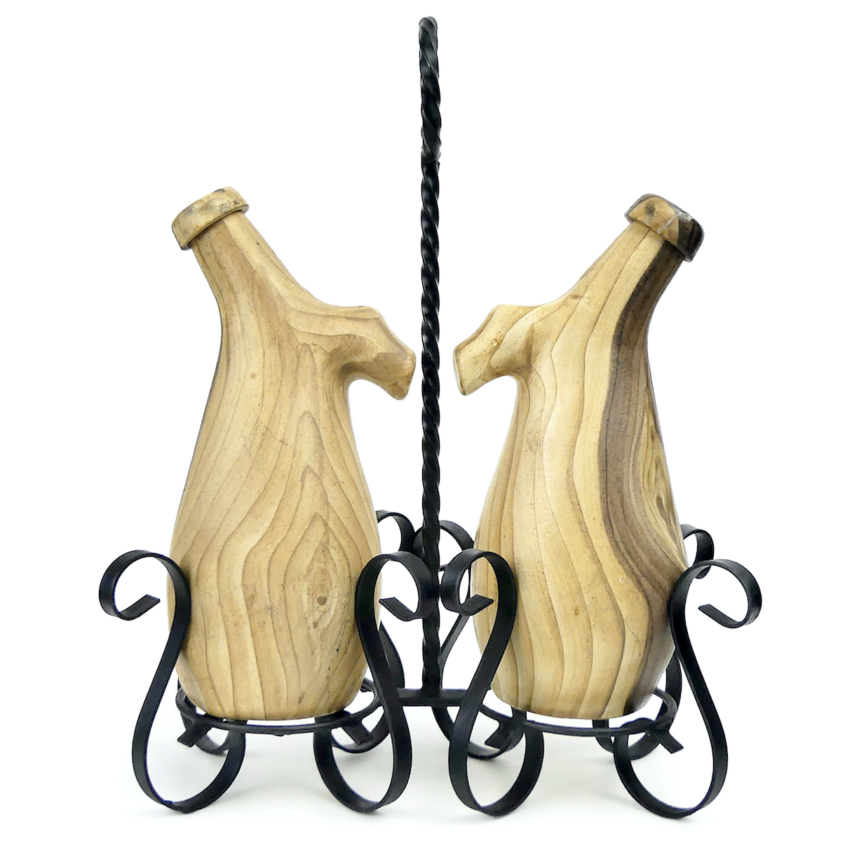 Ménagère huile et vinaigre Vallauris Grandjean-Jourdan en porcelaine et fer forgé noir, porte huile et vinaigre, service de table, serviteur vintage, de forme libre, piriforme, imitant le bois d’olivier – Artisanat français