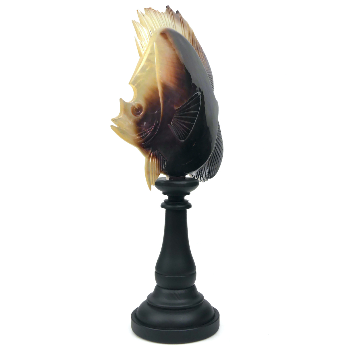 Nacre poisson tropical aux 2 petits mabe sur pied en bois tourné noir – Coquille d’huître perlière polie et ciselée – Polynésie