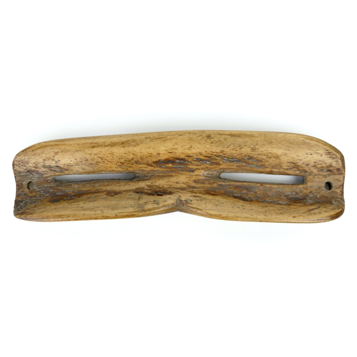 Les extrémités sont percées de trous où était glissé un lien de cuir permettant le maintient sur le nez, au niveau duquel, la matière est creusée afin d’offrir une meilleure tenue.