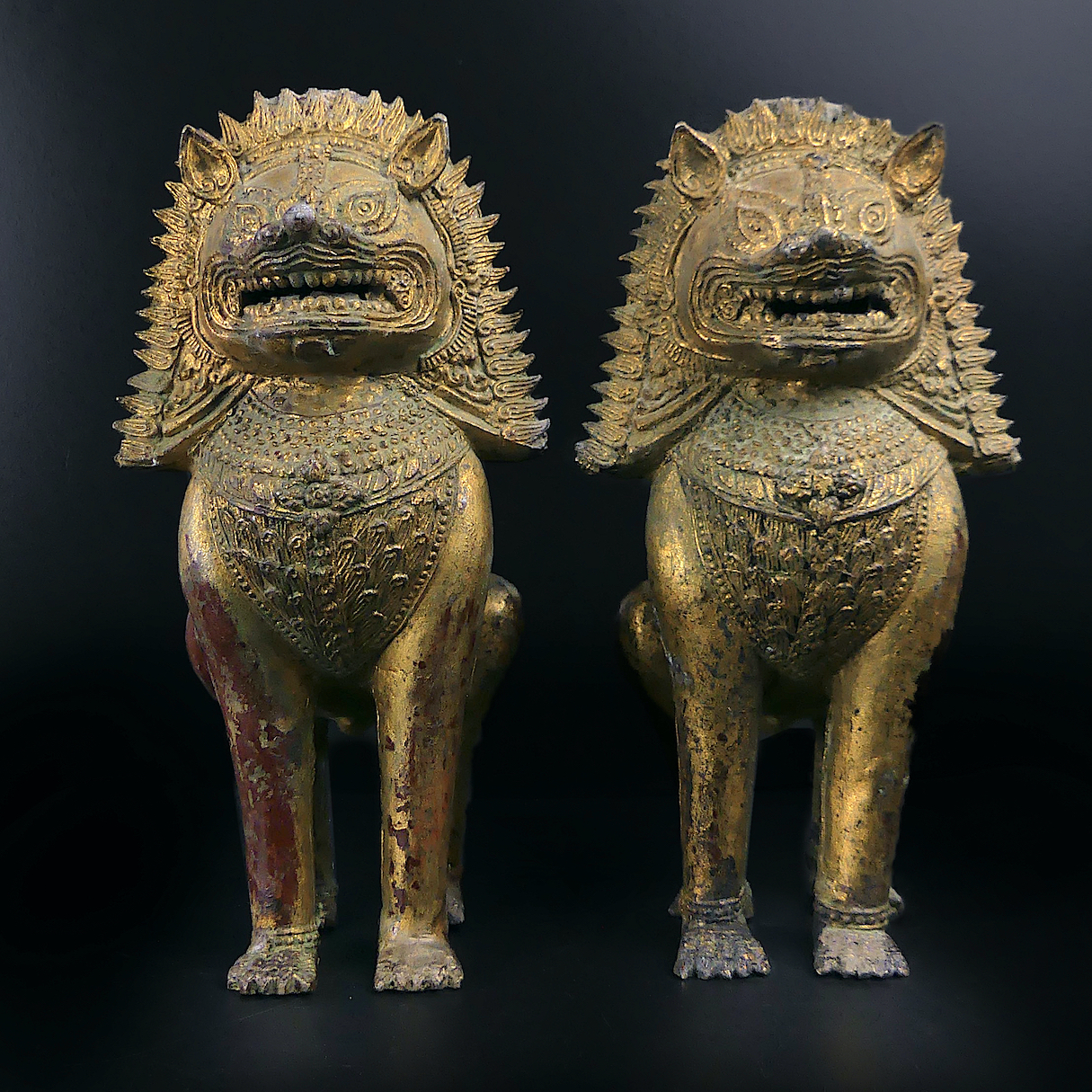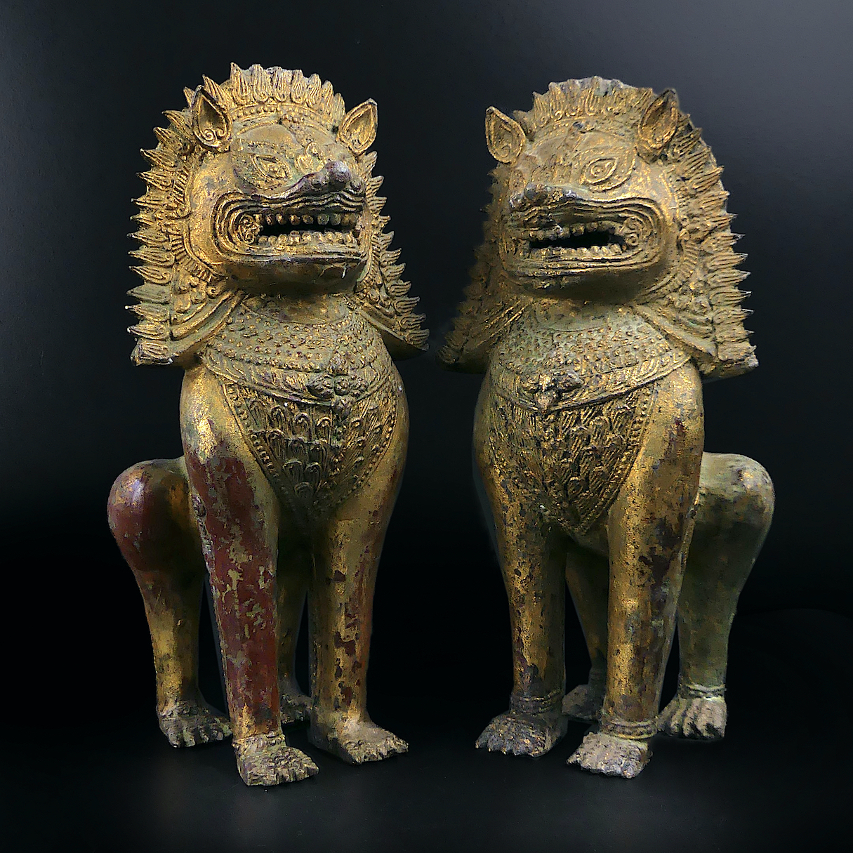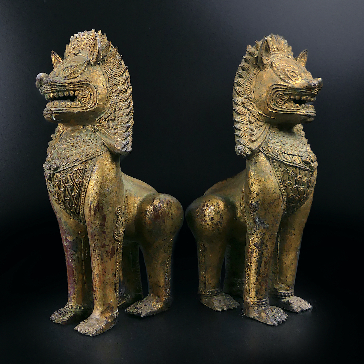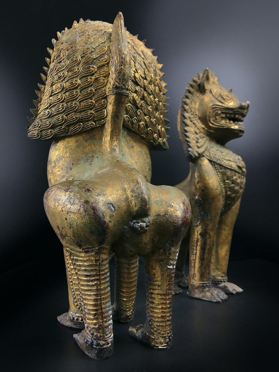 Paire de lions Singha gardiens de temple en bronze doré ciselé – Chiens de fô anciens de collection – Antiquité thaïlandaise