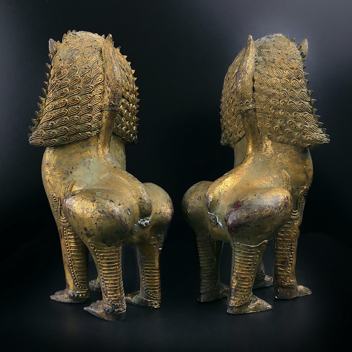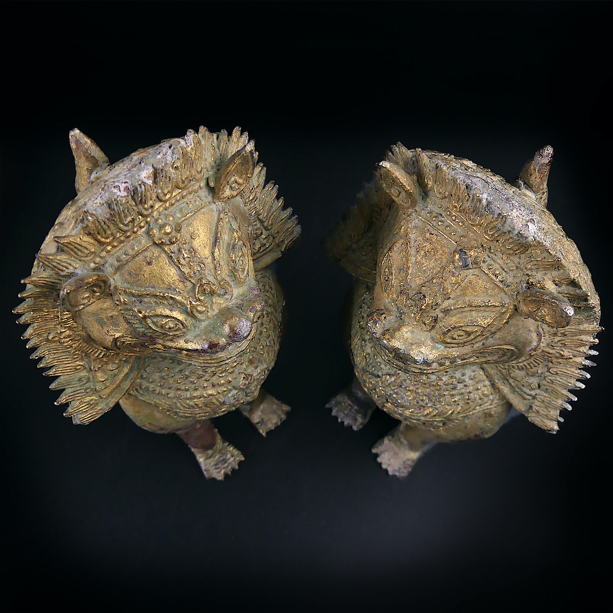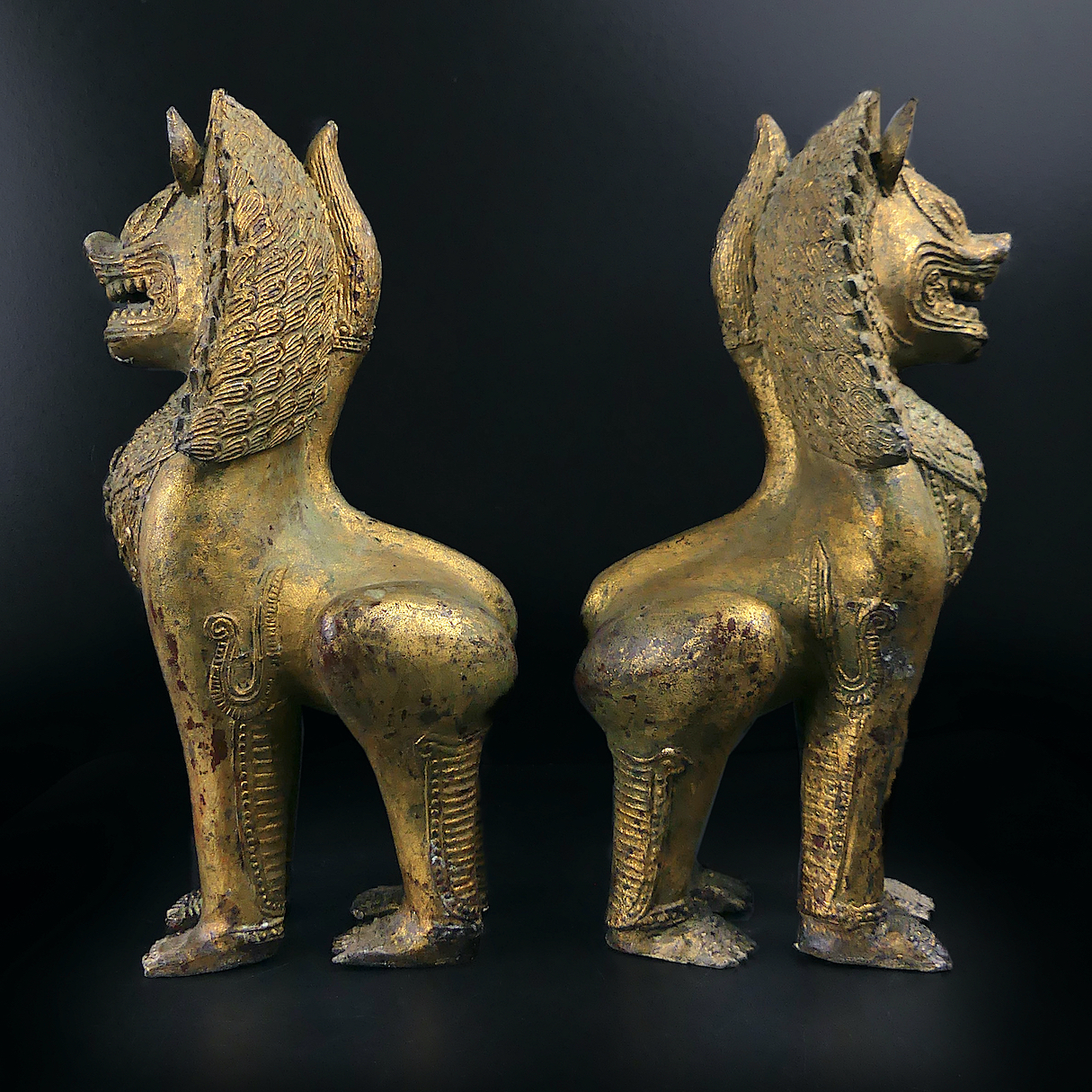 Paire de lions Singha gardiens de temple en bronze doré ciselé – Chiens de fô anciens de collection – Antiquité thaïlandaise