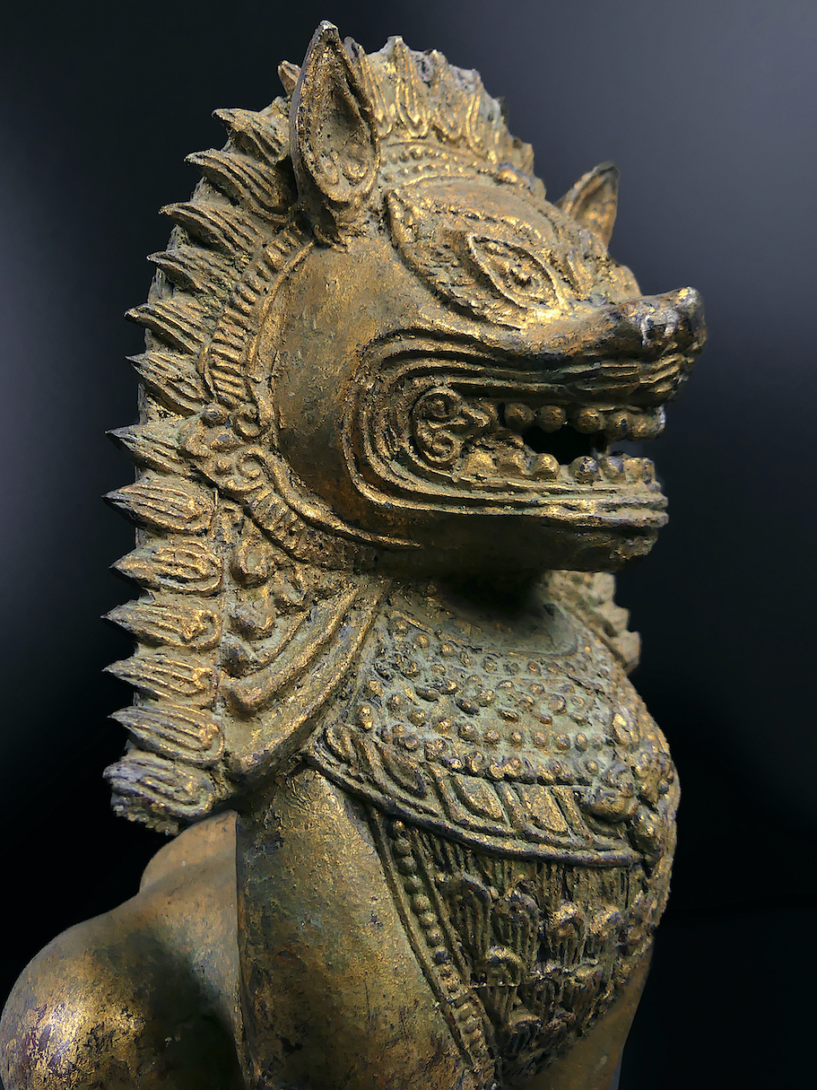On trouve ce lion dans toutes les cultures asiatiques, en Birmanie, il est appelé Chinthe, créature semblable à un lion présente à l’entrée des stûpas et temples bouddhistes.
