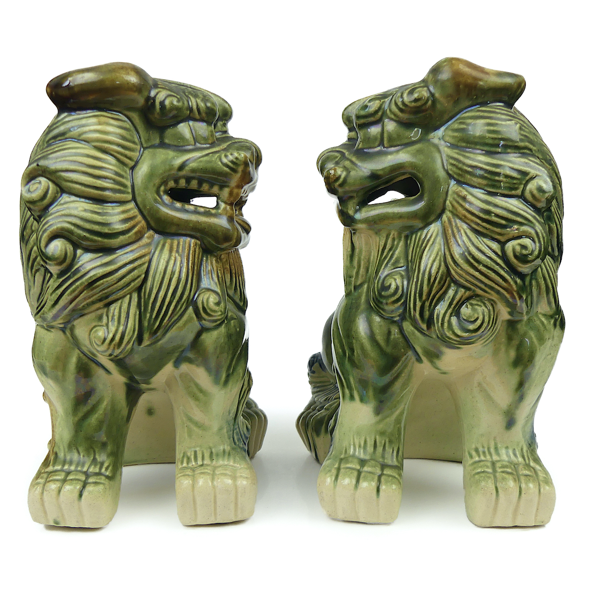 Paire de Shisa lions en porcelaine japonaise d’Okinawa, de la période Shōwa, aux tons vert beige – Porcelaines anciennes de collection – Japon