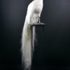 De longues plumes d’un blanc immaculé aux motifs complexes couvre le corps de l’oiseau.