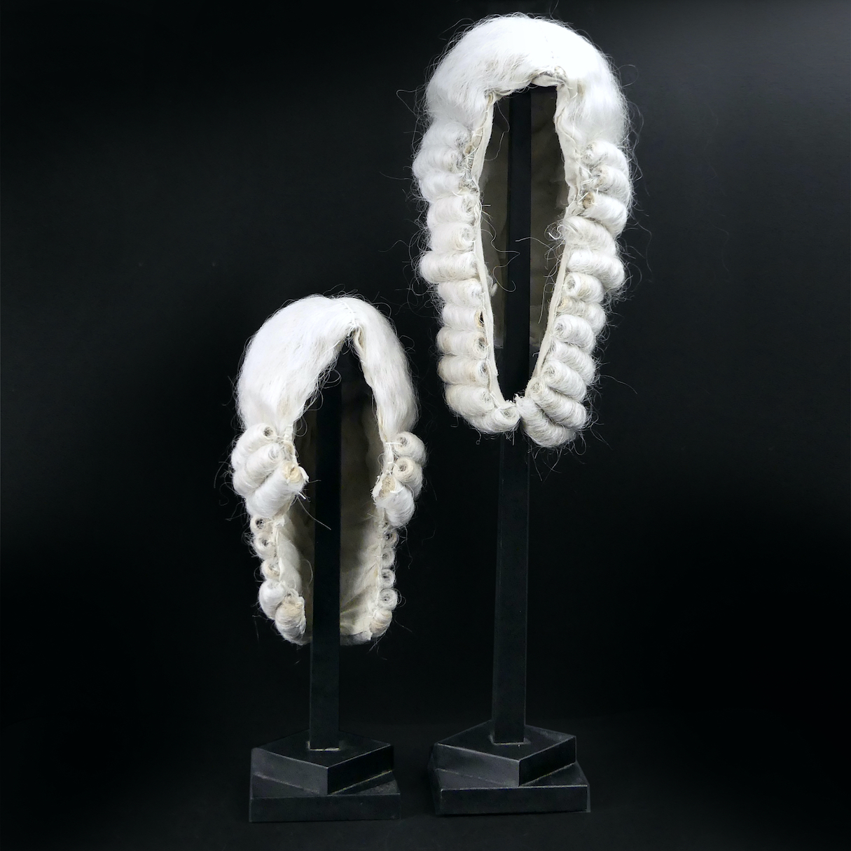 Perruque courte blanche sur porte perruque en bois noir moderne – Cabinet de curiosités