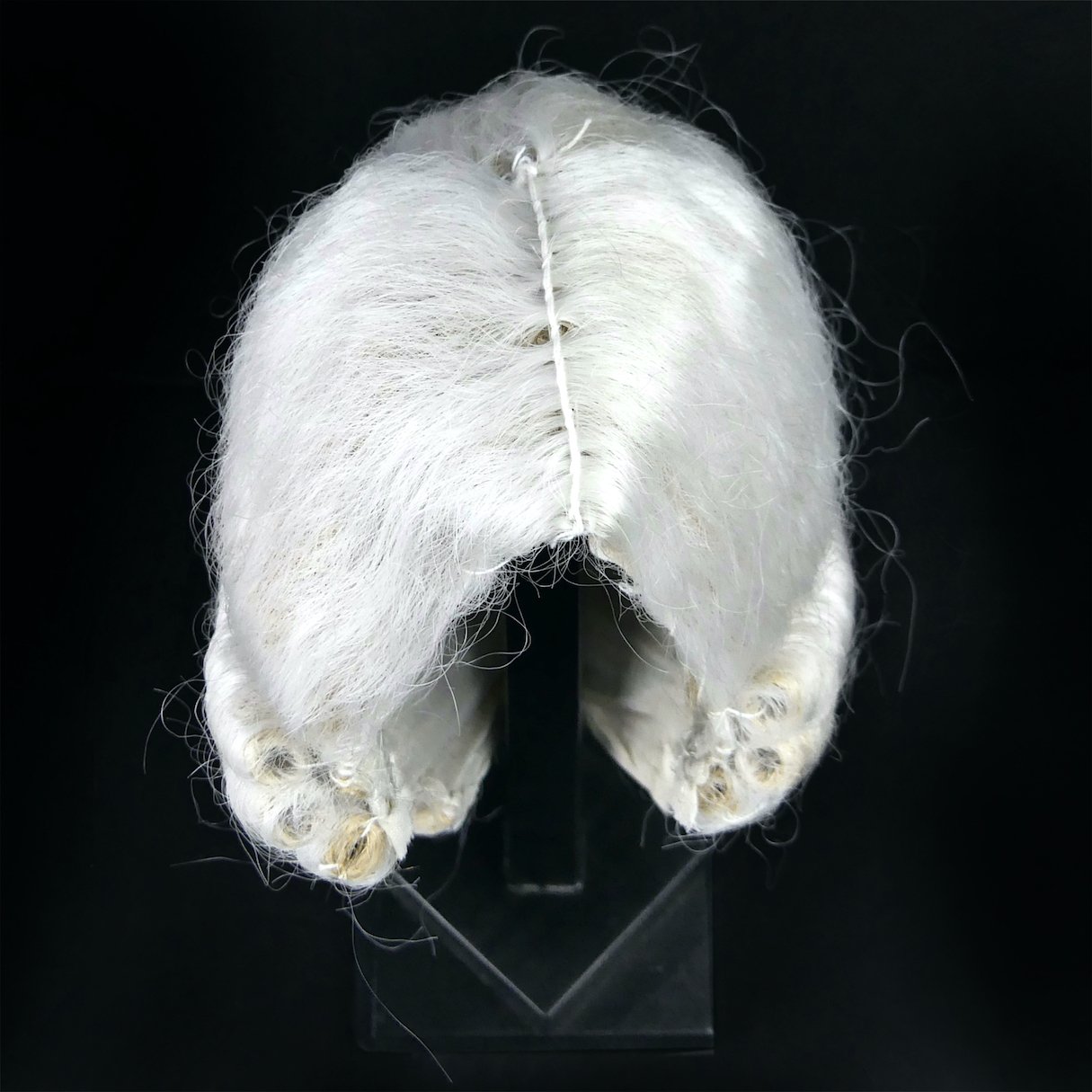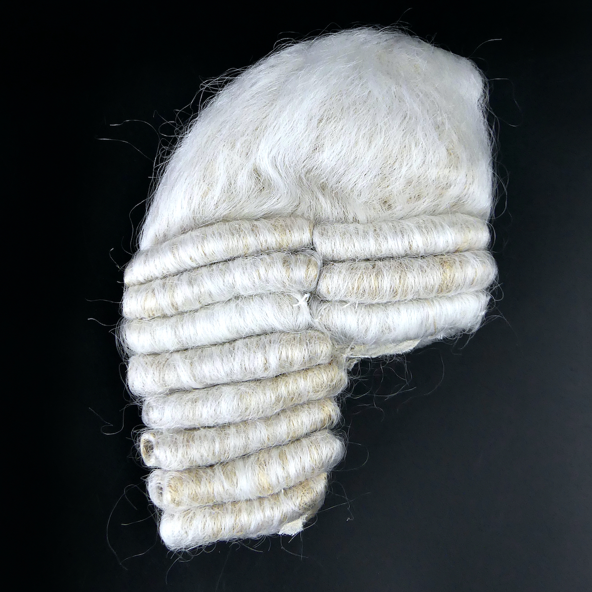 Perruque courte blanche (avocat, juge, Lord, théâtre,…) confectionnée à la main avec piqûres apparentes et doublure en tissus à large maille (gaze).