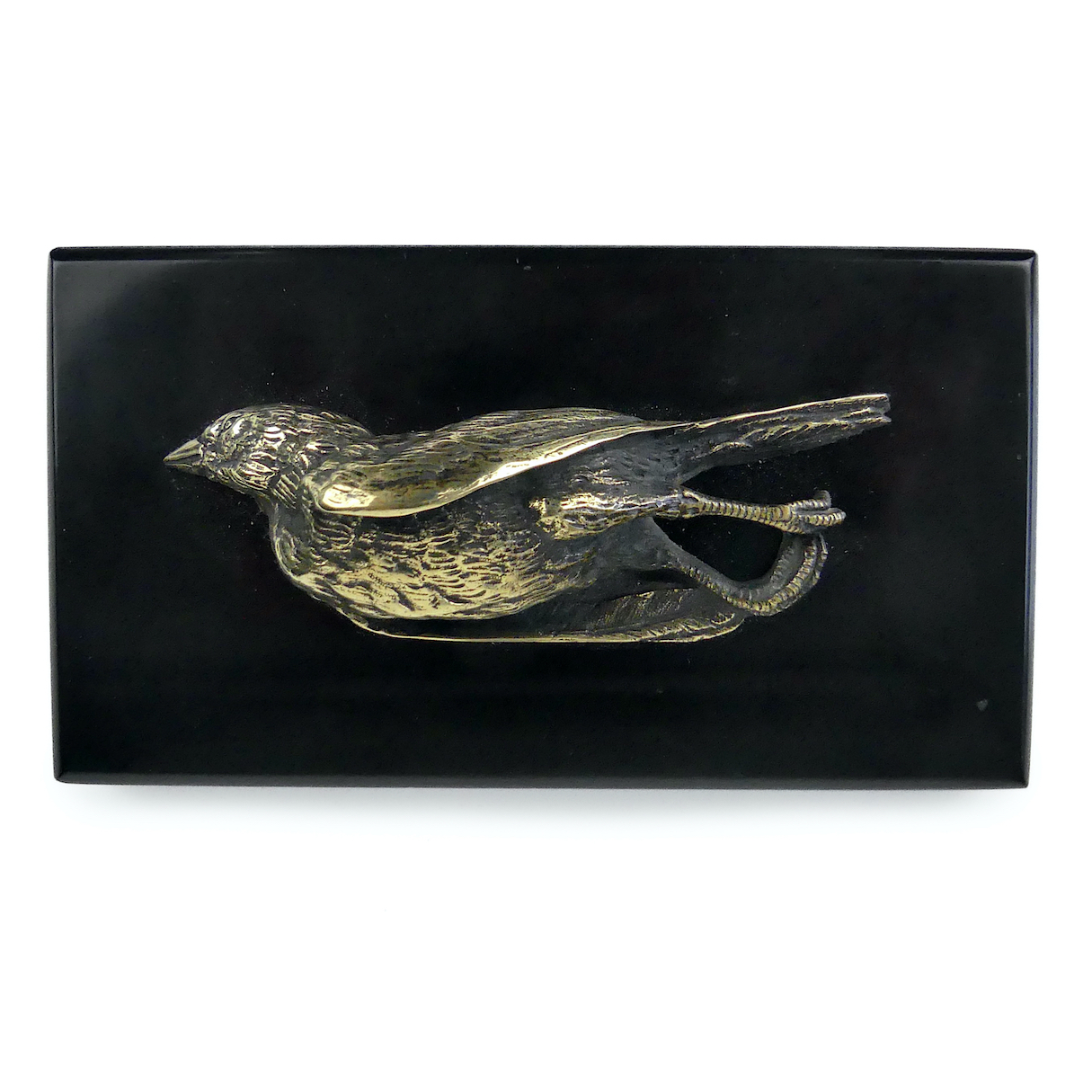 Petit oiseau mort en bronze patiné sur plaque de marbre noir – Presse-papier ancien – Cabinet de curiosités – Bronze animalier