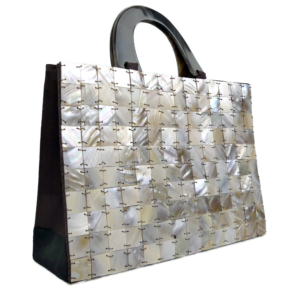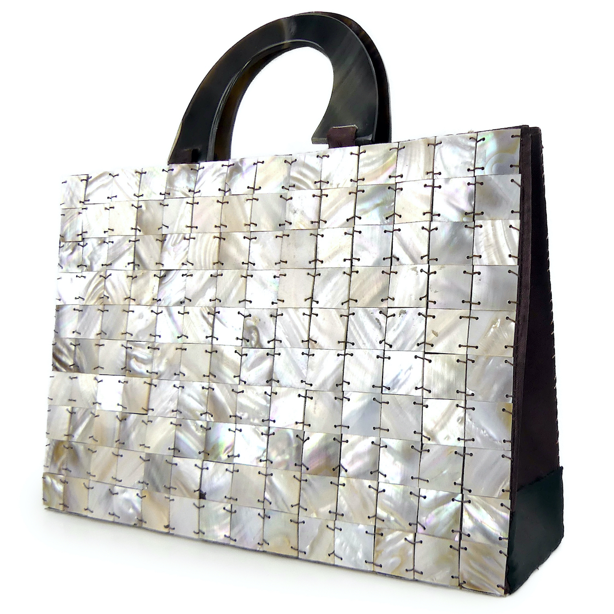 Petit sac de soirée très graphique, élégant et stylé, fabriqué à partir de petits carrés de nacre irisée (336 pièces), cousus entre eux sur les 2 faces et le dessous.