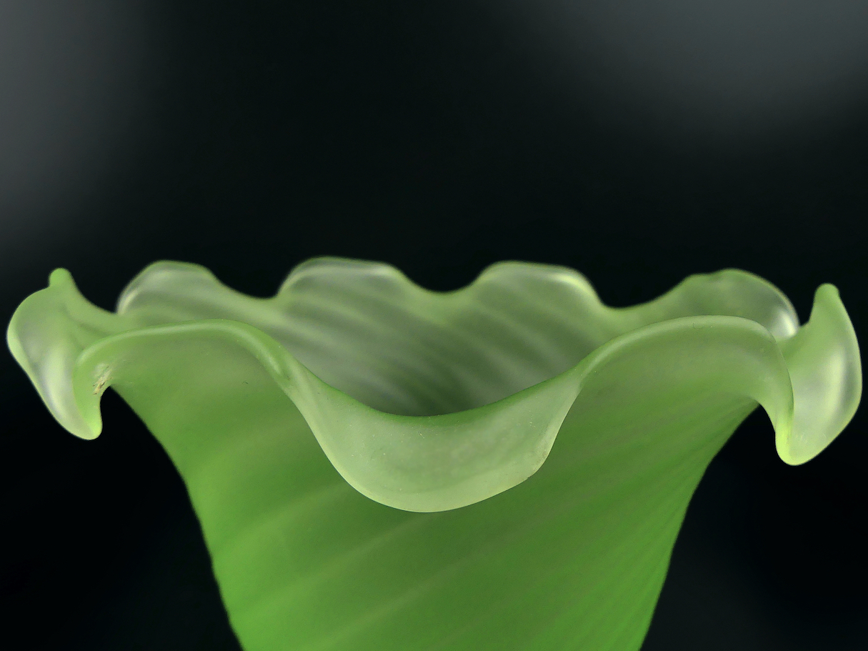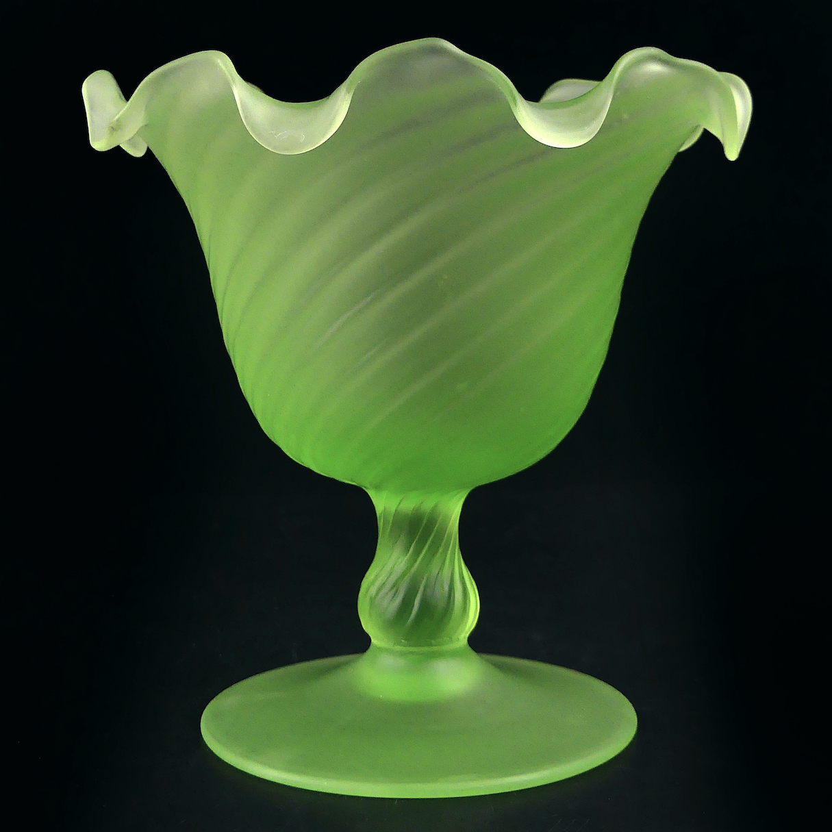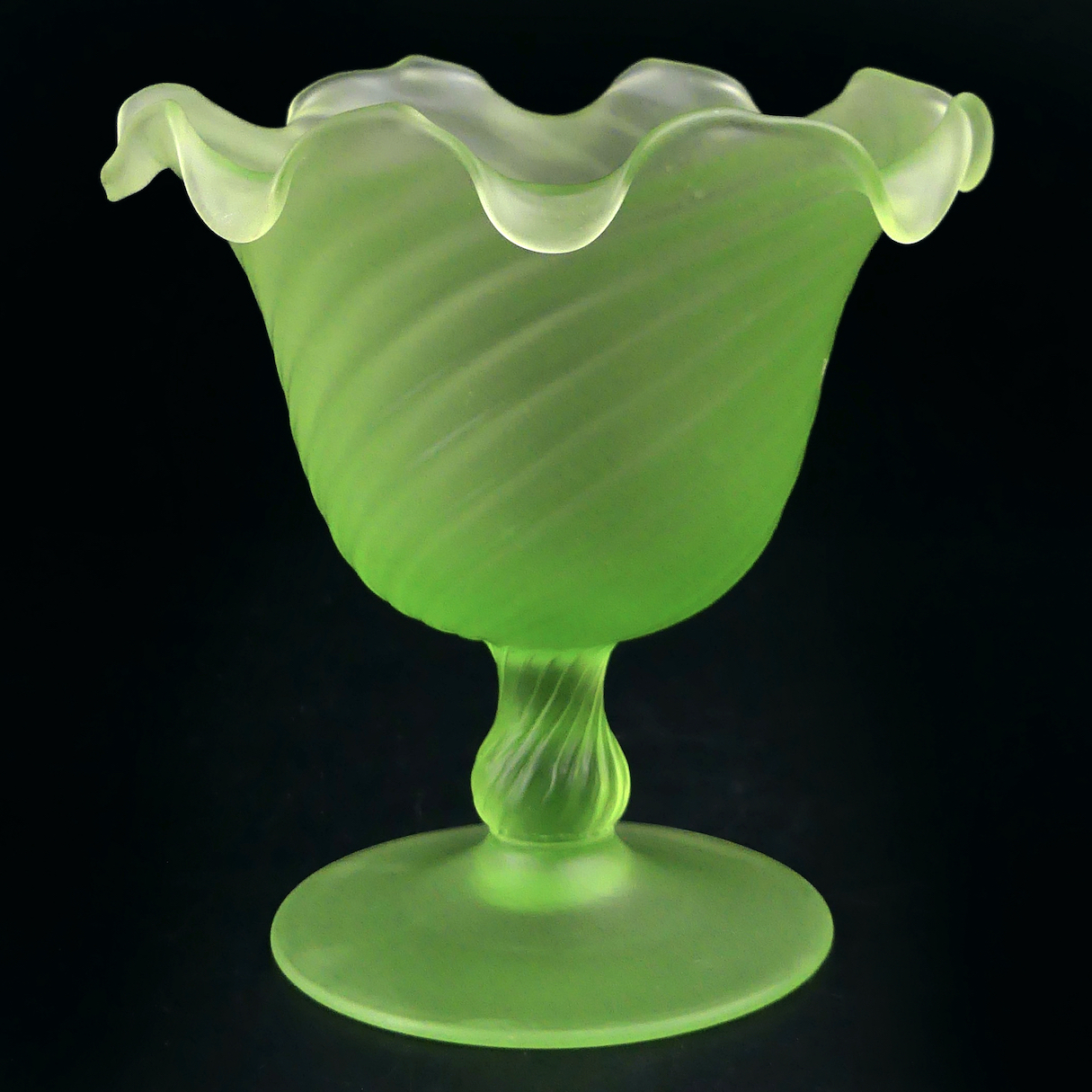 Petite coupe Corolle en ouraline – Verre dépoli fluorescent – Objet rare de collection – Début XXe – France – Pied : Ø 10.5 cm – Ø 15.5 x 16 cm – 0.595 kg