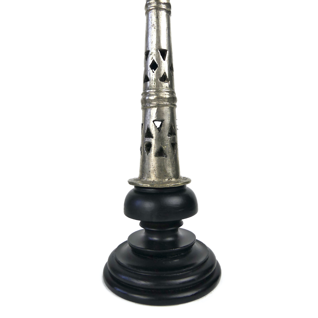 Petite croix copte orthodoxe éthiopienne argentée sur pied en bois tourné noir – Objet liturgique