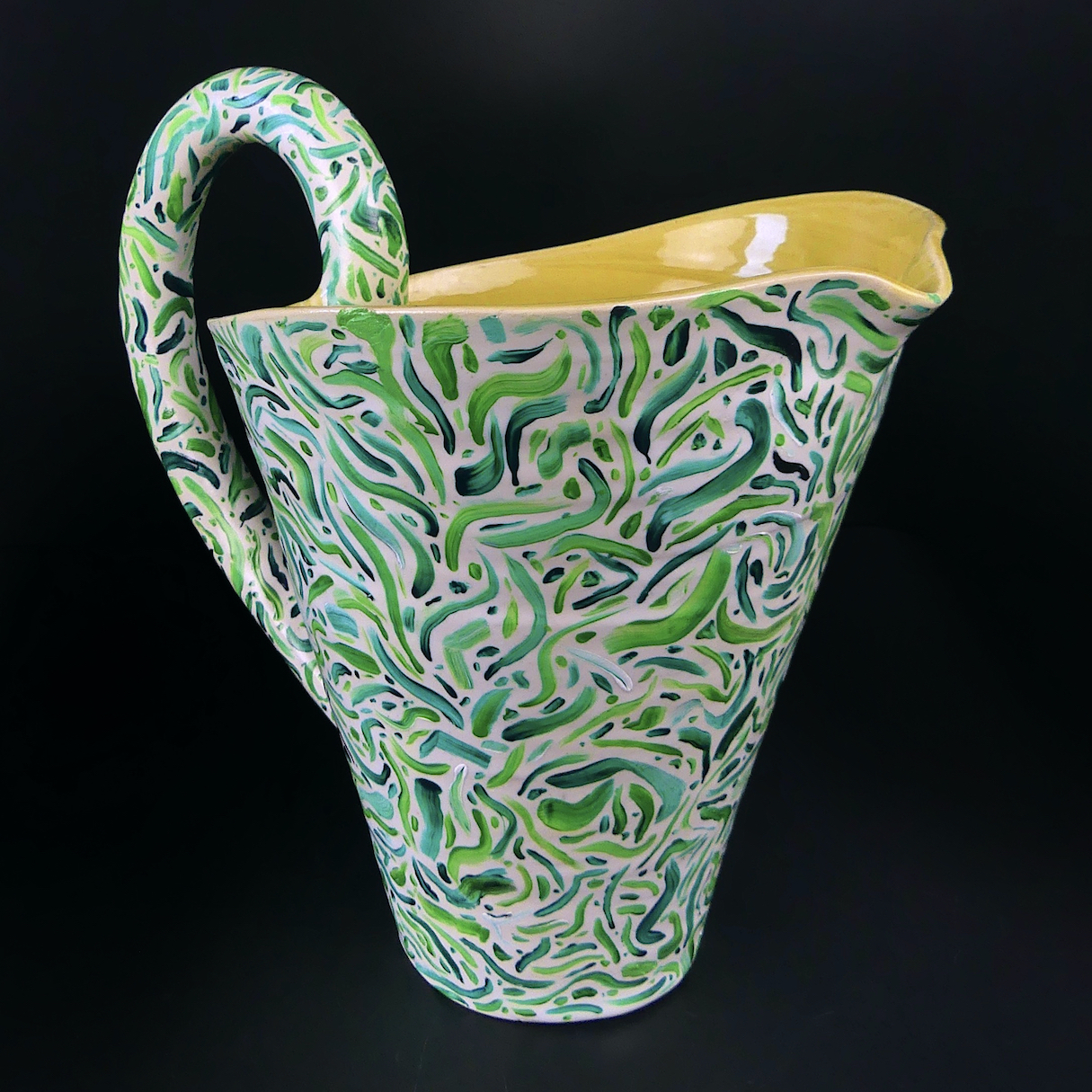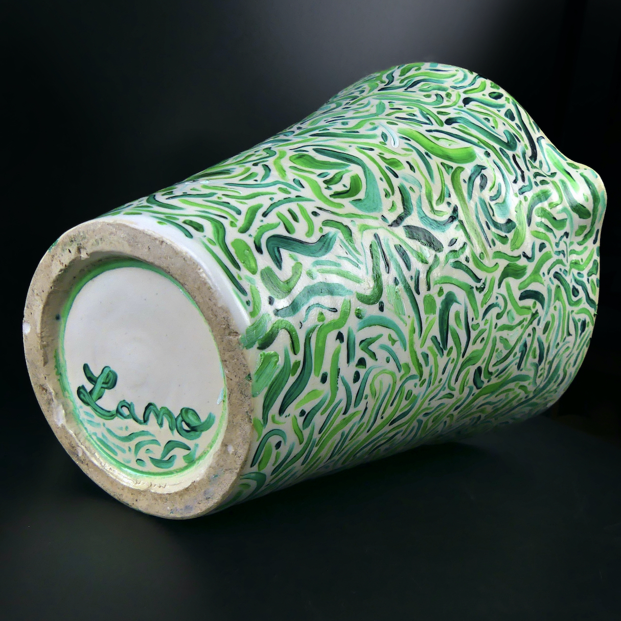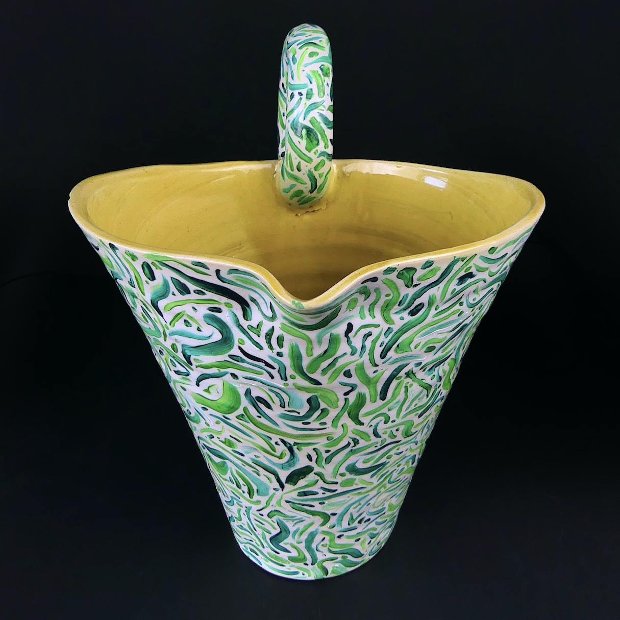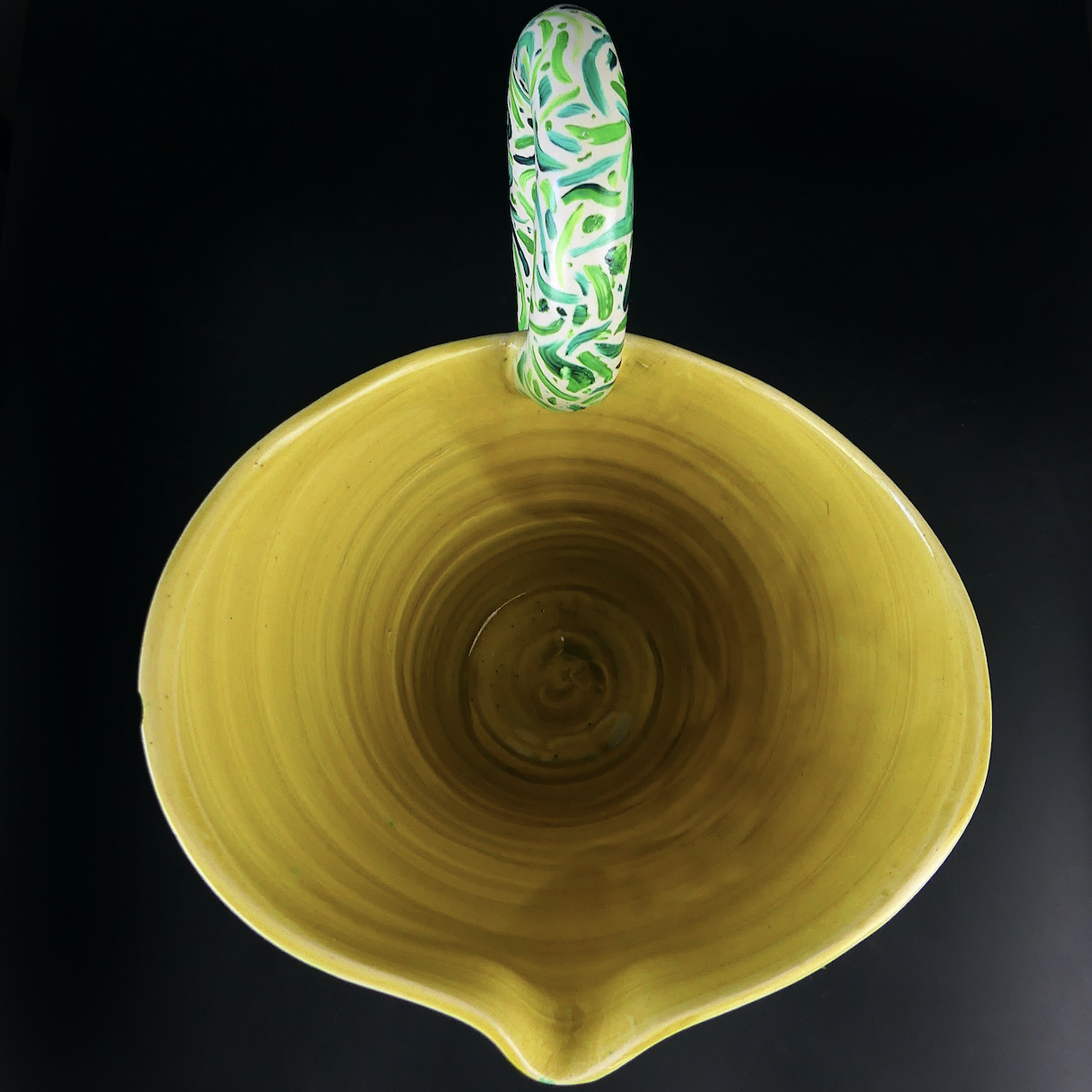 Pichet vase vintage 70 conique en céramique verte blanche et intérieur jaune, décoré à la main, avec bec verseur et anse – Signé Lano – Déco rétro – Céramique de collection