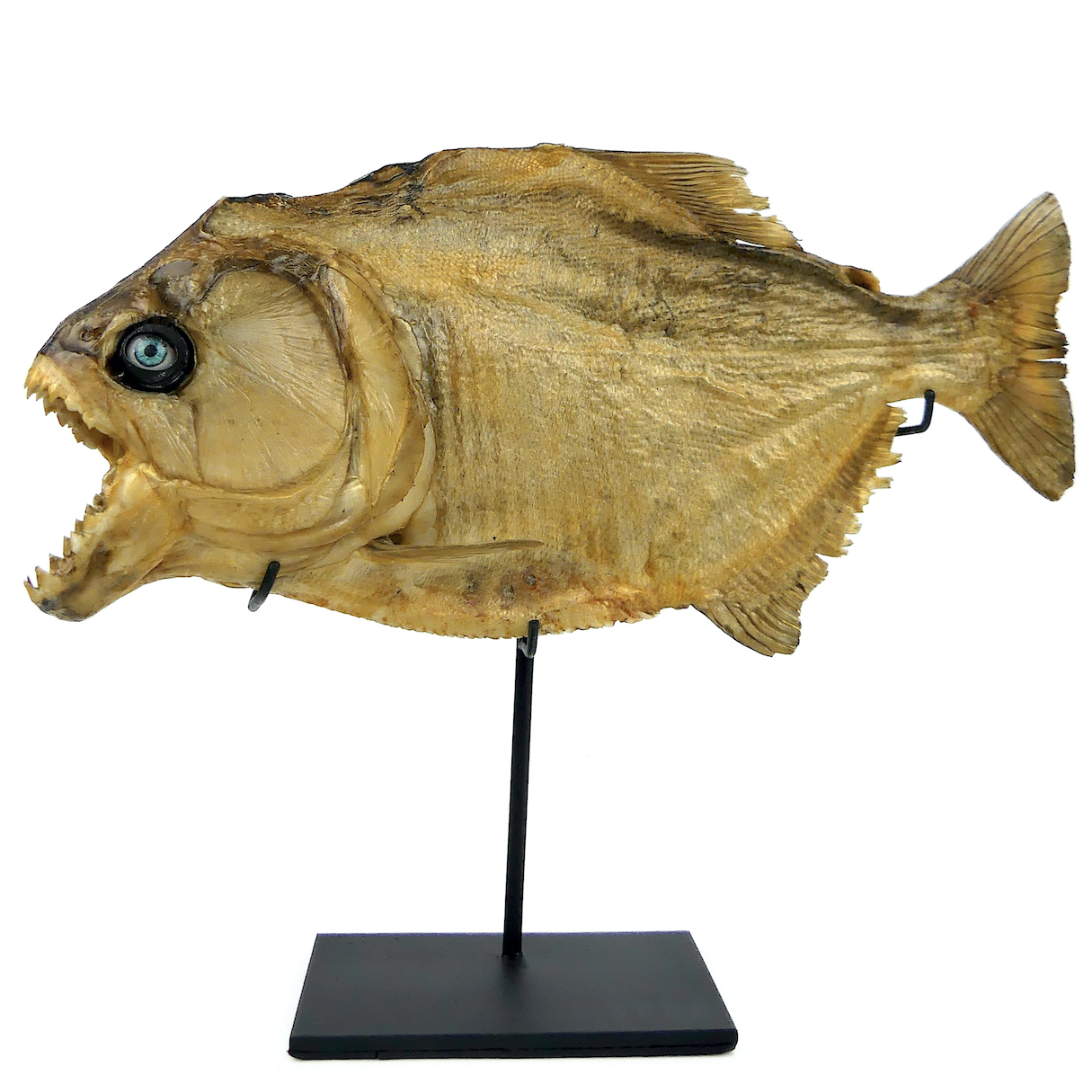 Grand piranha naturalisé aux yeux de poupée sur pied métallique noir – Serrasalminae – Taxidermie – Cabinet de curiosités