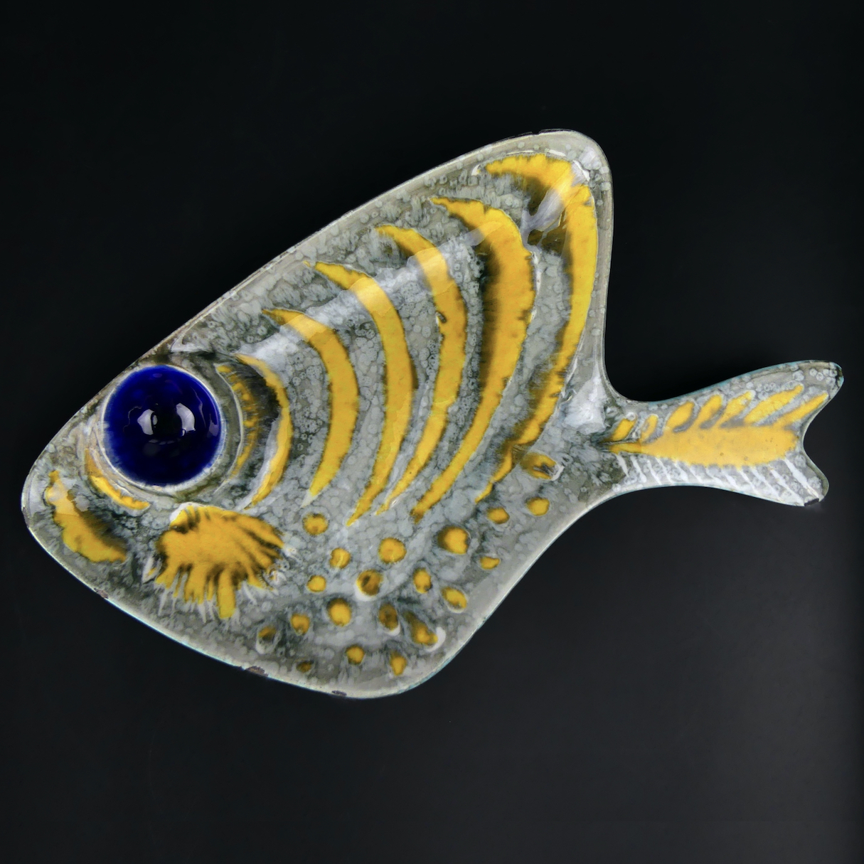 Plateau poisson tropical vintage en céramique des années 60 aux vives couleurs bleu turquoise, bleu cobalt, jaune, et gris Lava – Art de la table
