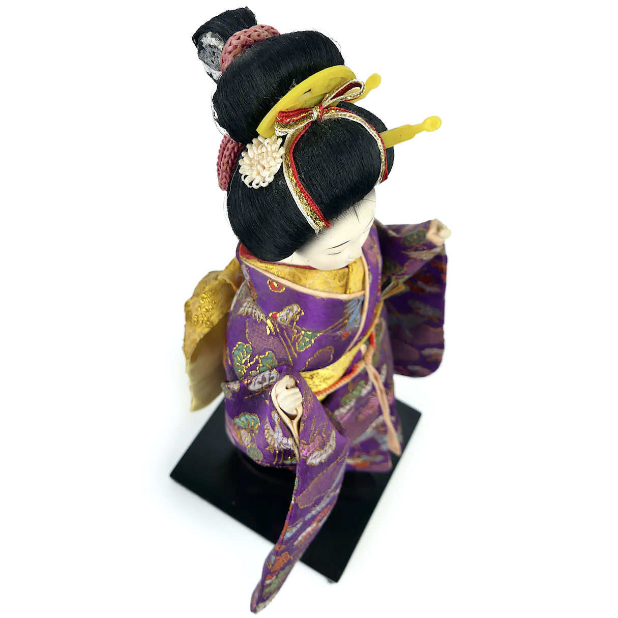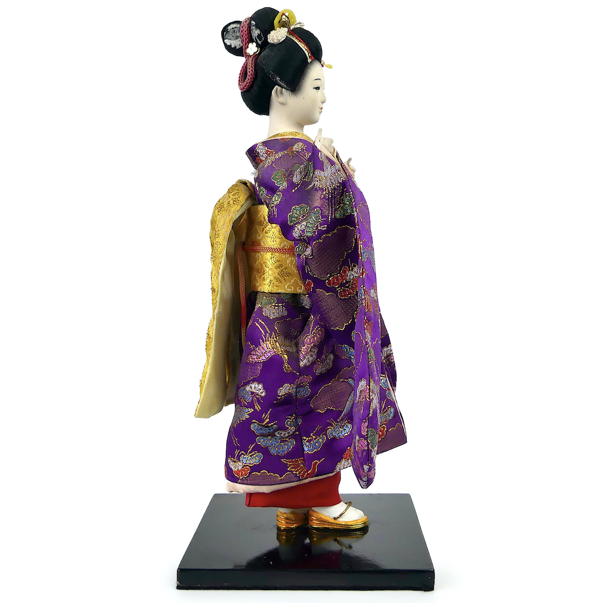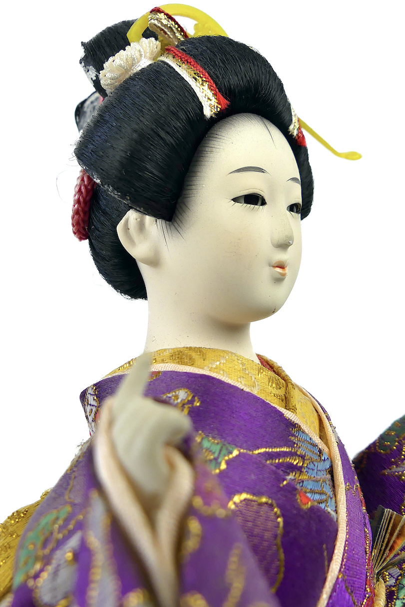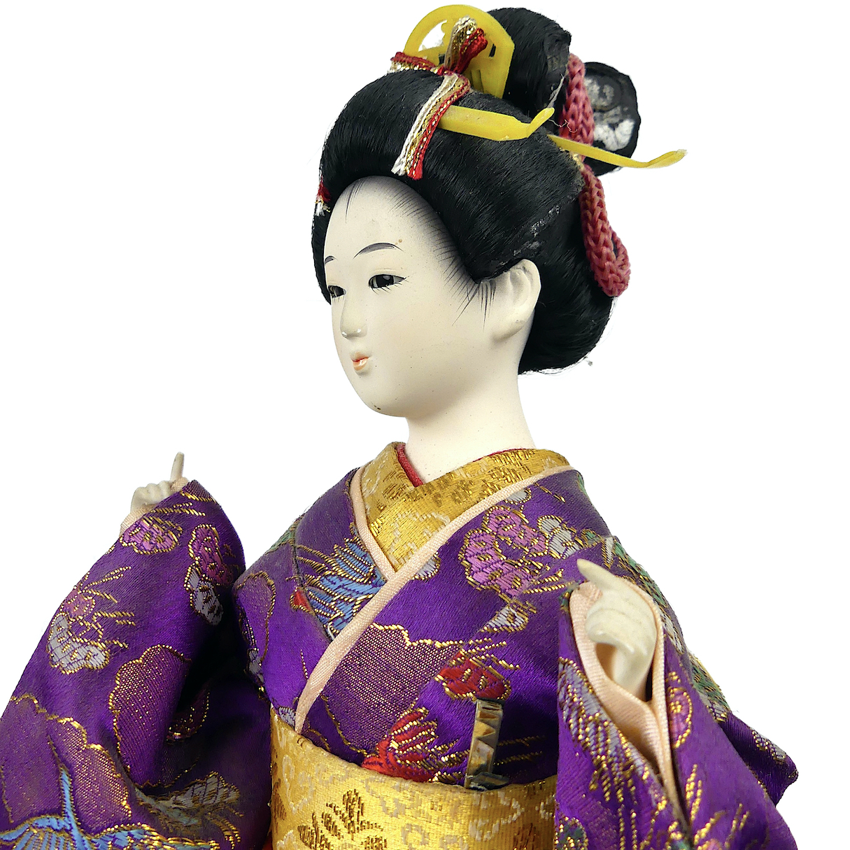 La poupée représente un geisha en tenue traditionnelle en brocart de soie, brodé à la main de motifs floraux, grues cendrées et nuages, d’un kimono violet, d’une ceinture dorée (Obi), de chaussettes blanches (Tabi), et robe rouge.