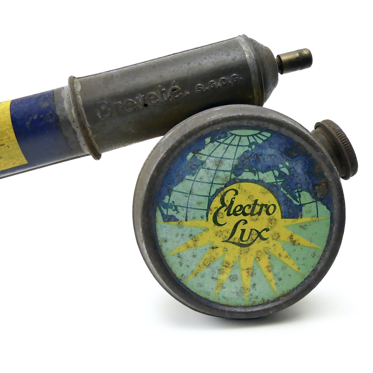Ancien pulvérisateur métallique à cire liquide de la marque ELECTRO-LUX, constitué d’un long tube imprimée, une pompe avec poignée en bois, un réservoir cylindrique à bouchon vissé, et une buse.
