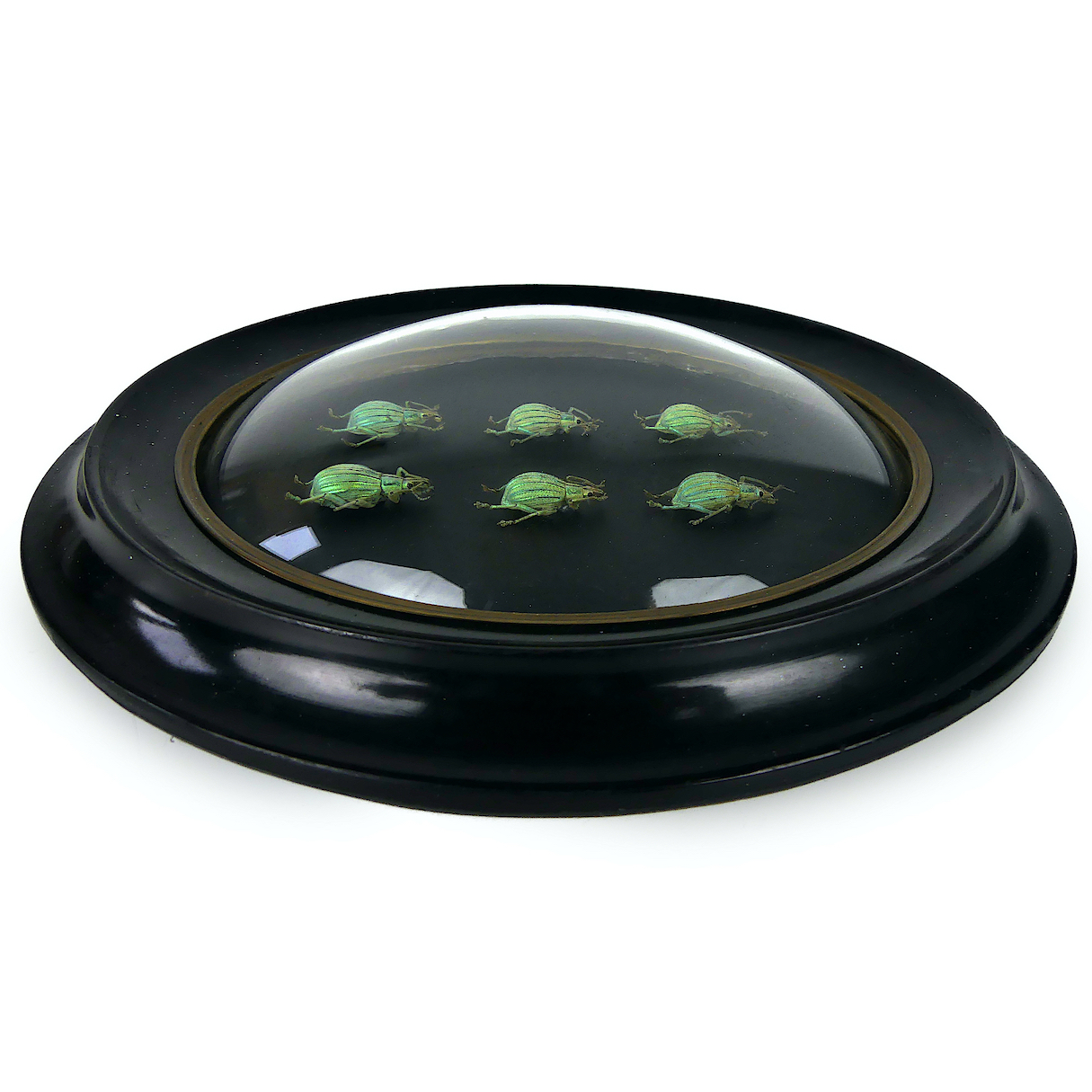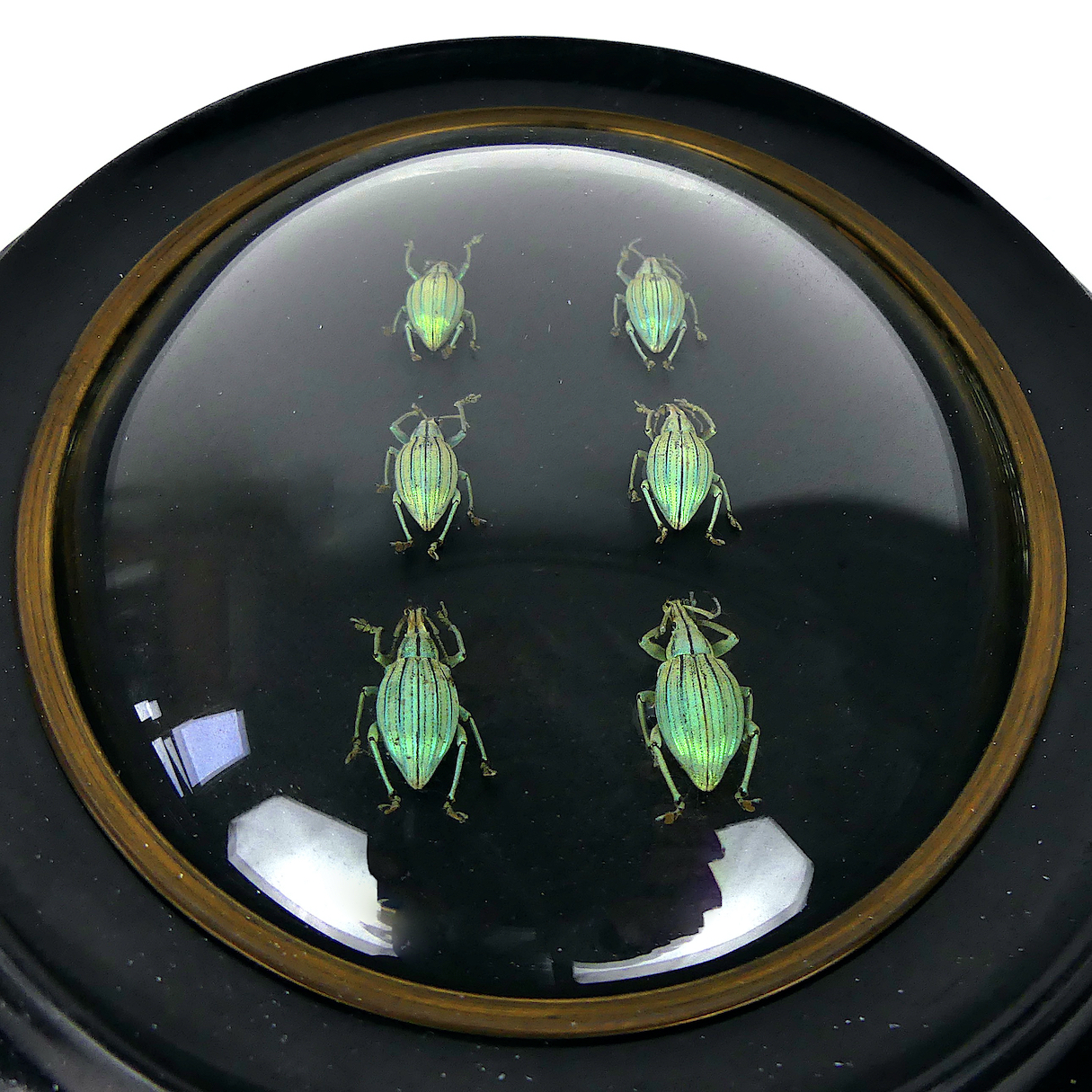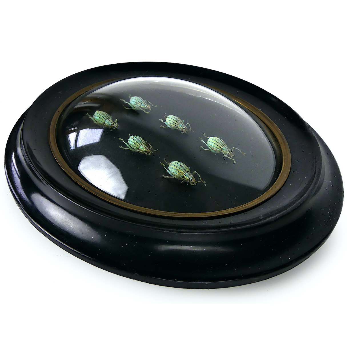 Six Celebia arrogans, petits charançons verts aux reflets métalliques, originaires d’Indonésie, présentés sous verre bombé et cadre noir ovale Napoléon III.
