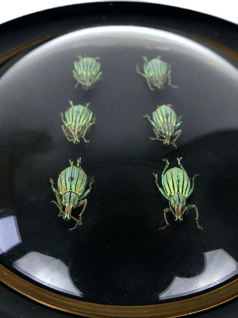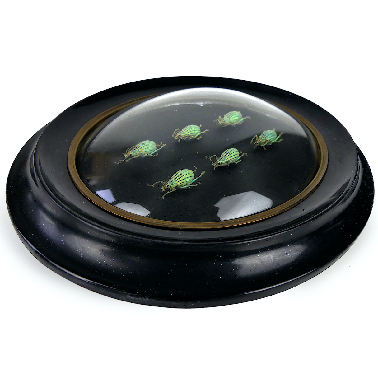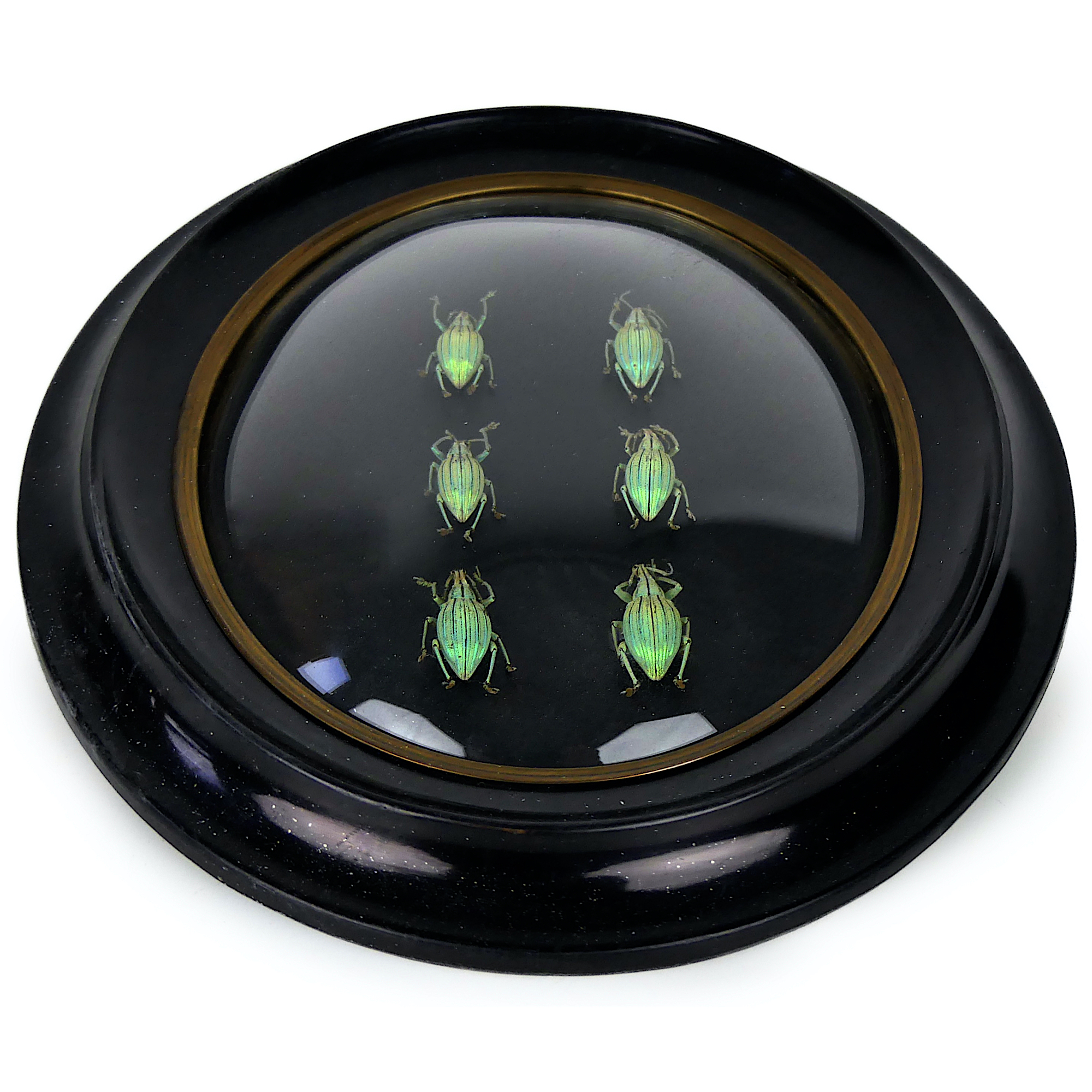 Six Celebia arrogans, petits charançons verts aux reflets métalliques, originaires d’Indonésie, présentés sous verre bombé et cadre noir ovale Napoléon III.