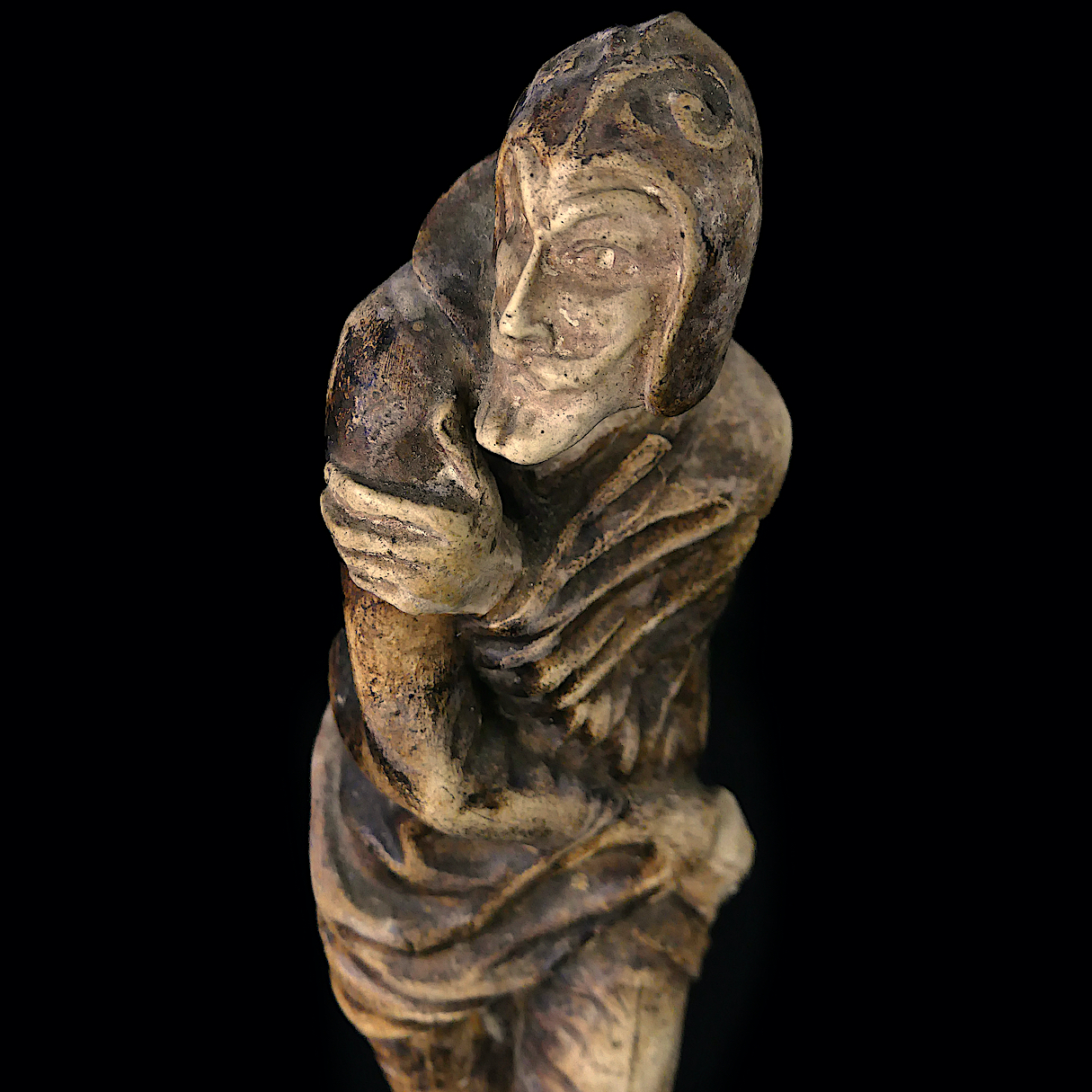 Il est vêtu, selon l’usage du XVIe siècle, de chausses extrêmement ajustées.