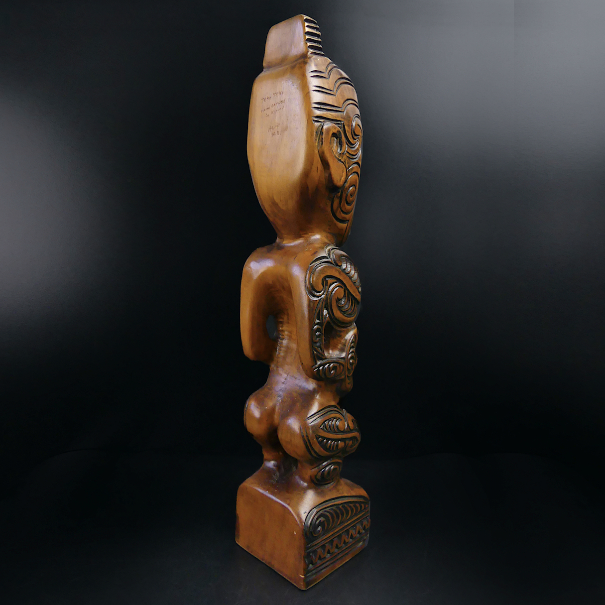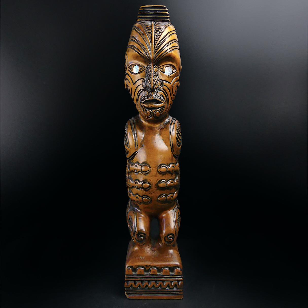 Sa figure est masculine au corps long et élancé, visage tatoué bien formé et des yeux incrustés de coquille pāua (grand ormeau de Nouvelle-Zélande avec une coquille intérieure bleu-vert).