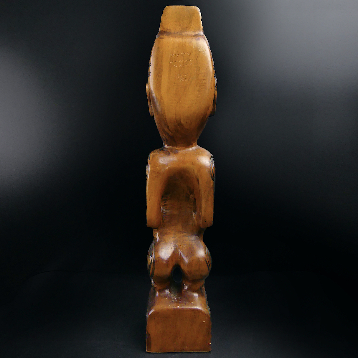 Teko Teko Poutokomanawa Māori signé en bois de Kauri sculpté avec les yeux en ormeau – Nouvelle-Zélande – Culture Māorie