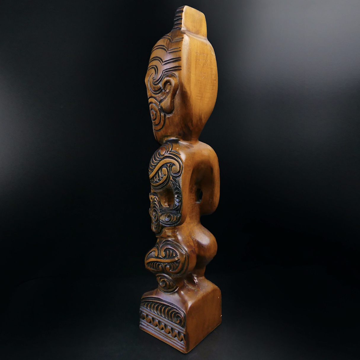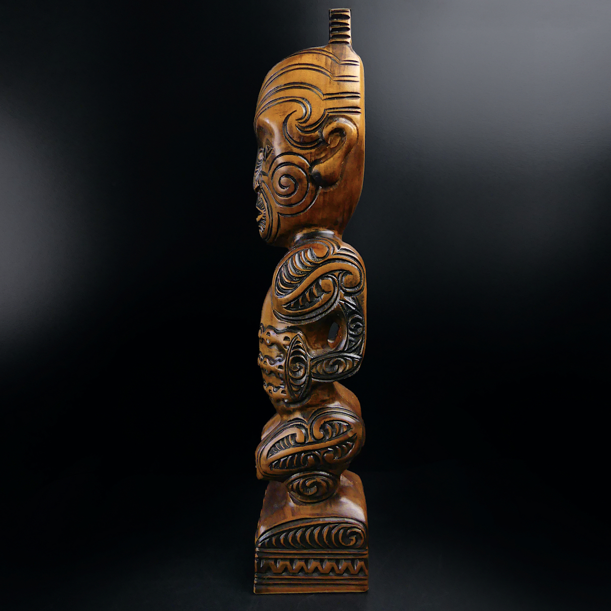 Teko Teko Poutokomanawa en bois de Kauri finement sculpté à la gouge, à belle patine, sur base carrée, ornée d’une frise géométrique traditionnelle.