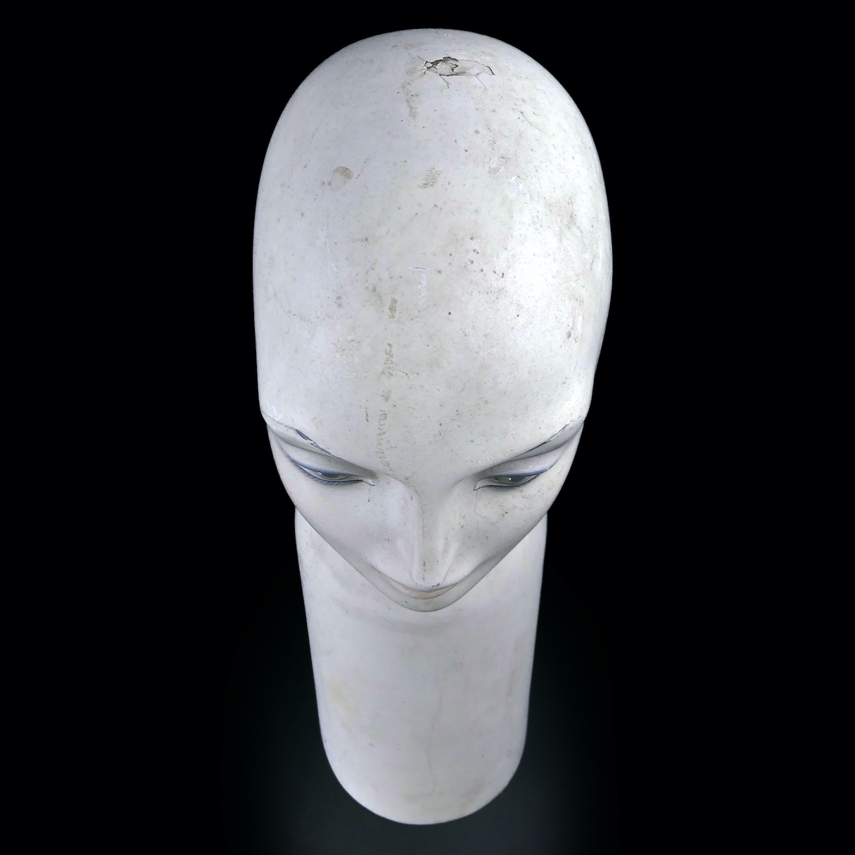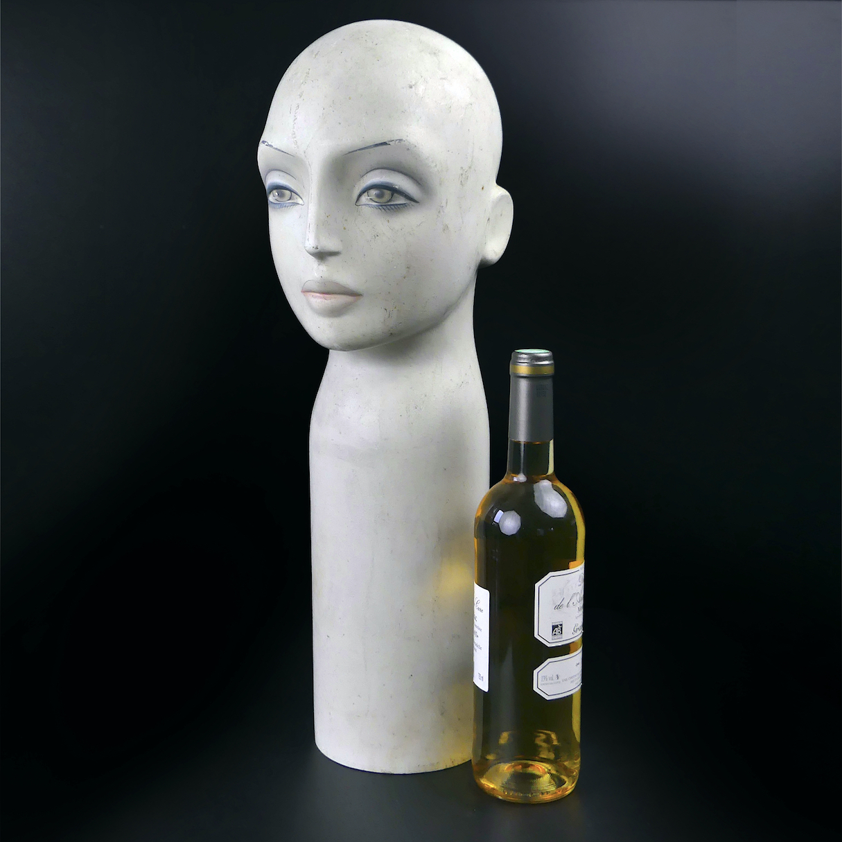 La tête en résine représente le beau visage d’une femme, légèrement maquillée de rose et bleu, au profil grec, petites oreilles, et grands yeux gris.