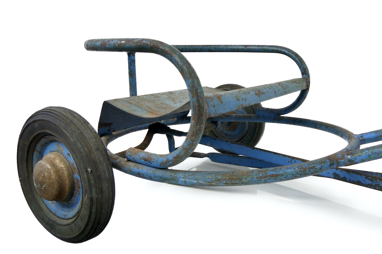 Tricycle enfant Le Paticycle France bleu, en fer, tôle et tubes – Estampille sur le tube de devant représentant une tour en pierre et la marque Le Paticycle France – Jouet ancien de collection