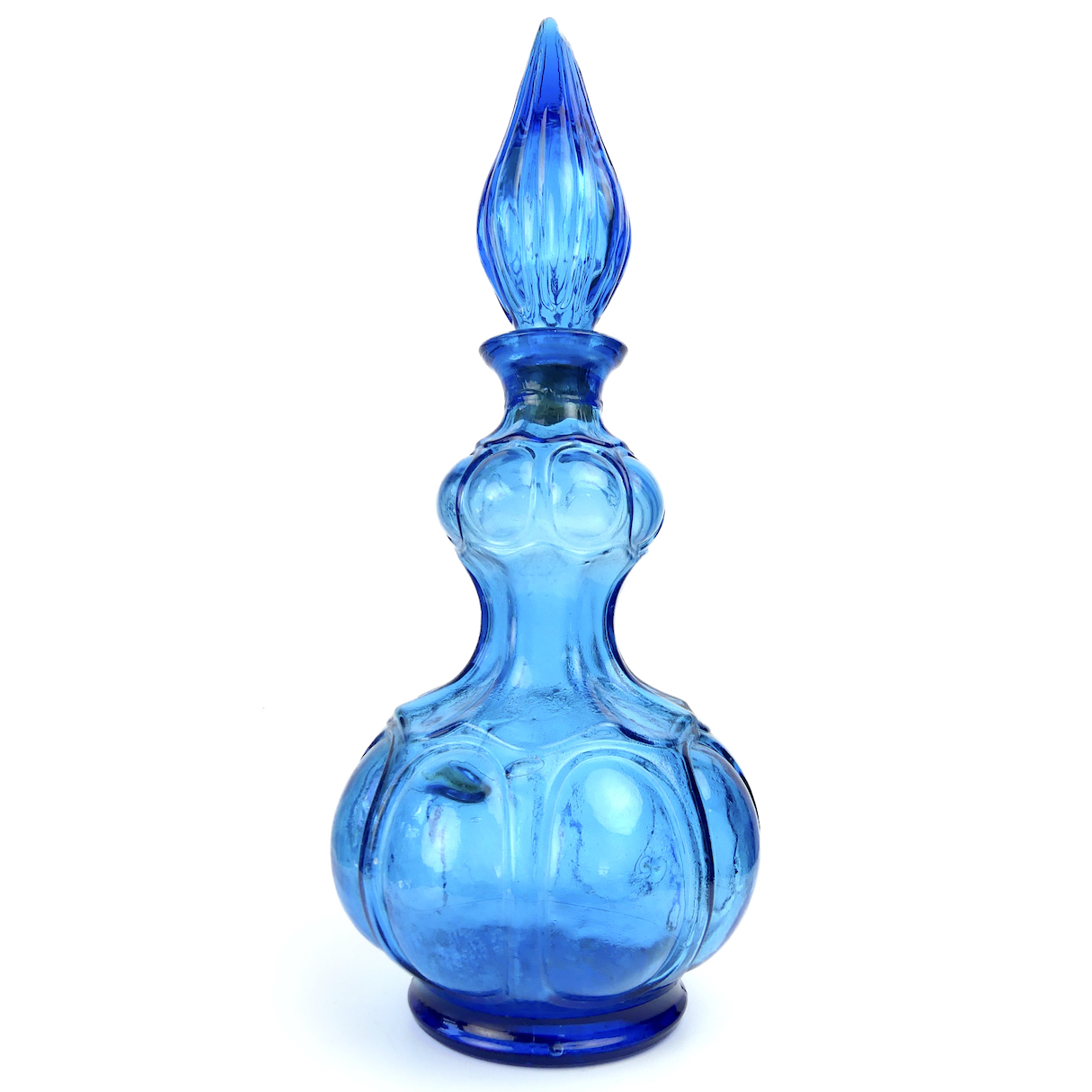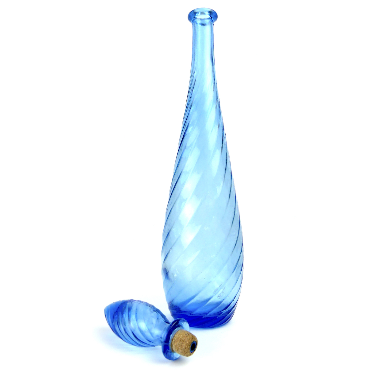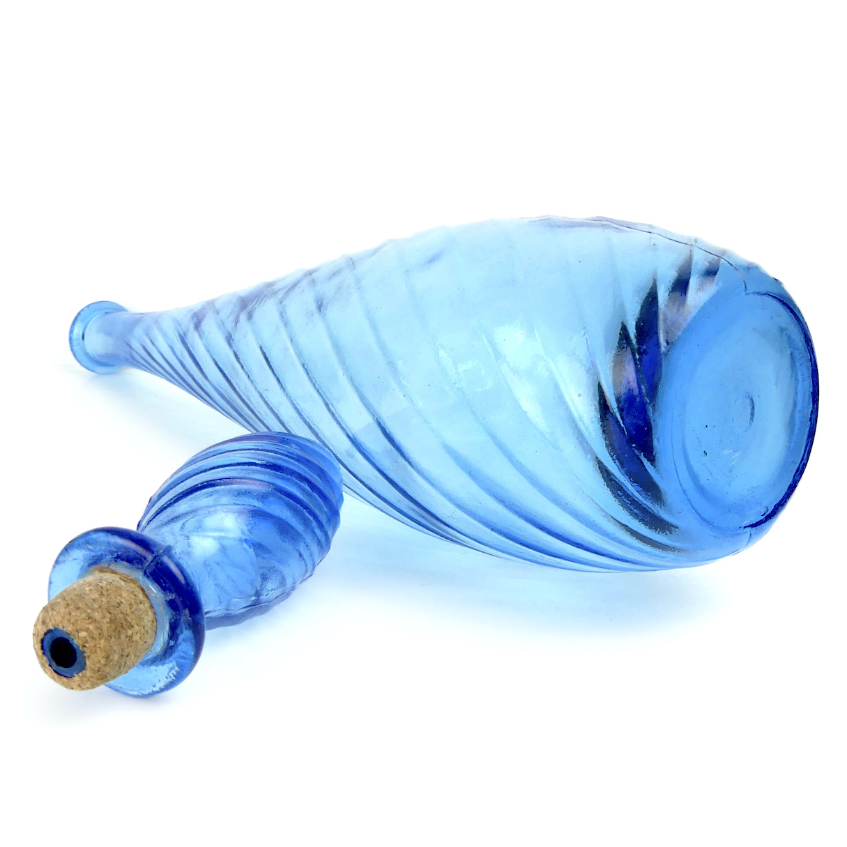 Ensemble de 3 carafes bleues fabriquées à Empoli, ville de Toscane, connue pour être la «cité du verre», avec bouchons flammes et liège.