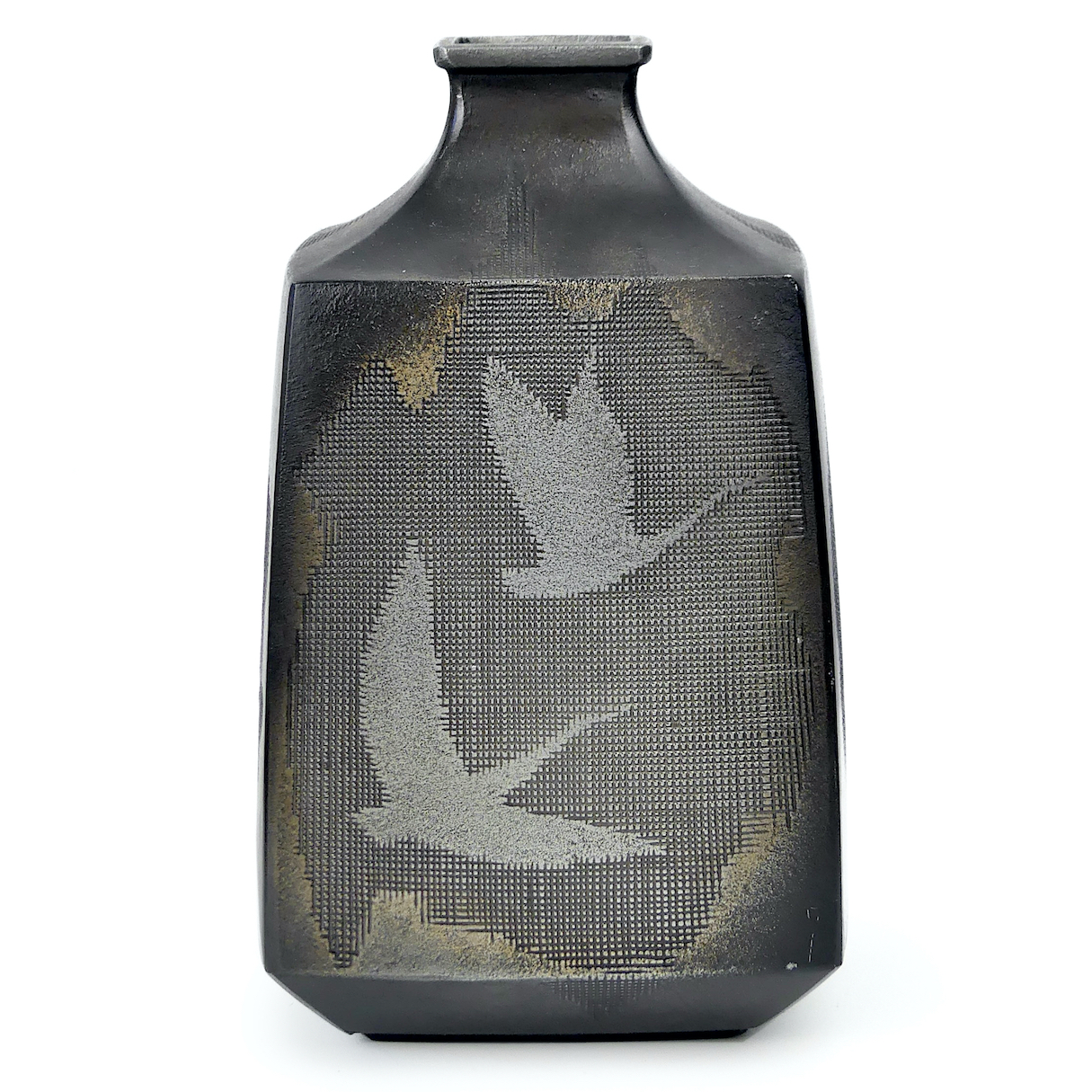 Vase japonais en métal gris argenté à 4 faces texturées de forme balustre décoré d’un vol de grues – Art Japonais de la période Shōwa